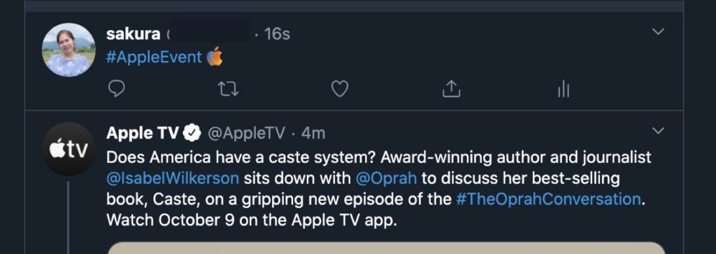ก่อนหน้านี้ในงาน Apple Event “Time Flies” เดือนกันยายนที่ผ่านมา Apple ได้เพิ่มแฮชแท็กที่มีโลโก้สีฟ้าก่อนที่จะมีการประกาศจัดงานและส่งบัตรเชิญ แต่ในครั้งนี้ได้เพิ่มแฮชแท็กหลังประกาศวันจัดงานและส่งบัตรเชิญ