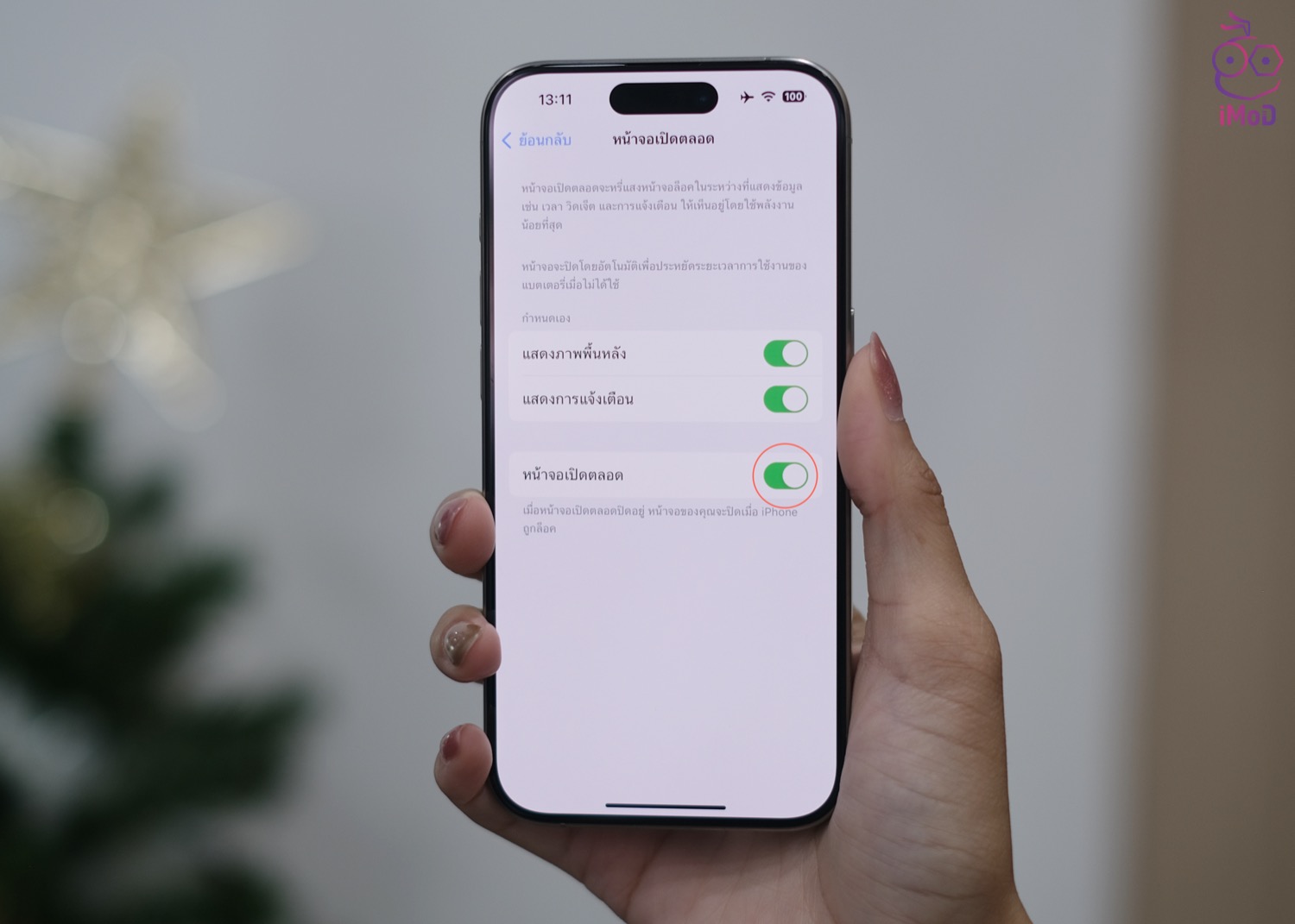 หลังจากเปิดใช้งานแล้วก็ลองกดปุ่มด้านข้าง แล้วดูว่าหน้าจอมืดลงและแสดงข้อมูลวันที่และนาฬิกาหรือไม่