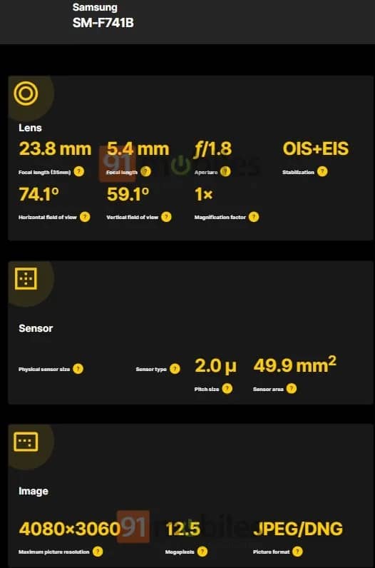 และยังพบข้อมูลของ Galaxy Z Flip 6 บนแอป Camera FV-5 เผยว่า จะใช้กล้องหลังหลัก 50MP (12.5 x 4 with pixel binning = 50.0), รูรับแสงของกล้องอยู่ที่ f/1.8, มีระบบกันสั่นภาพ EIS+OIS และระยะโฟกัส 5.4 มม.