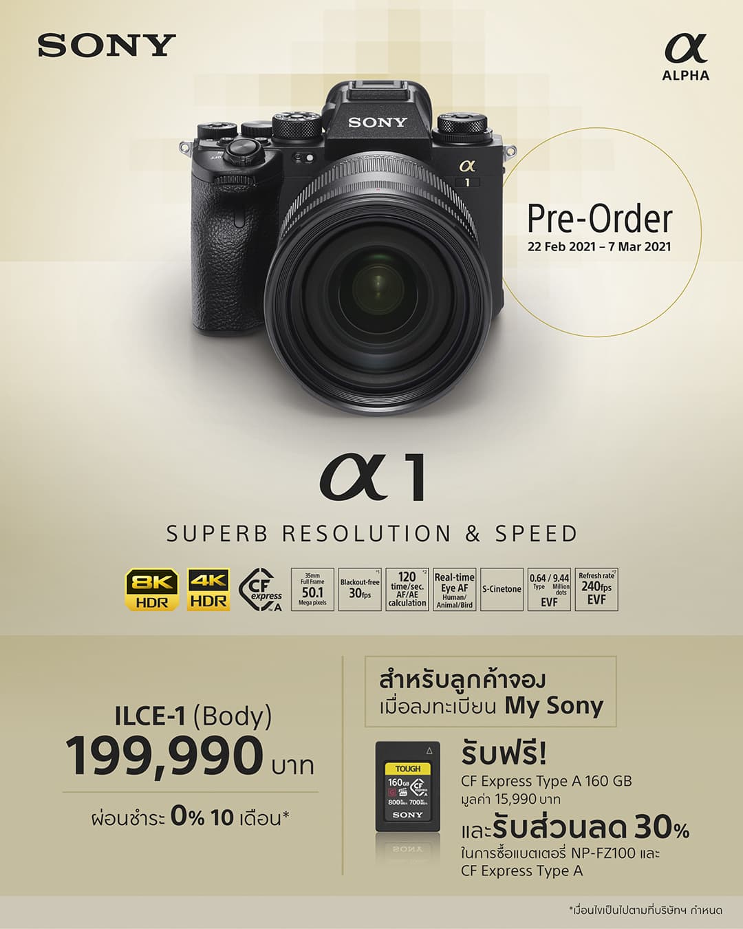 ทั้งนี้ โซนี่ไทยจะเปิดให้ผู้สนใจได้สั่งจองกล้อง Alpha 1 ล่วงหน้าในวันที่ 22 กุมภาพันธ์ ถึงวันที่ 7 มีนาคม ศกนี้ และหลังจากลูกค้าได้รับสินค้า พร้อมลงทะเบียนในระบบ My Sony ภายในวันที่ 31 มีนาคม 2564 ลูกค้าจะได้รับของสมนาคุณพิเศษ ดังนี้