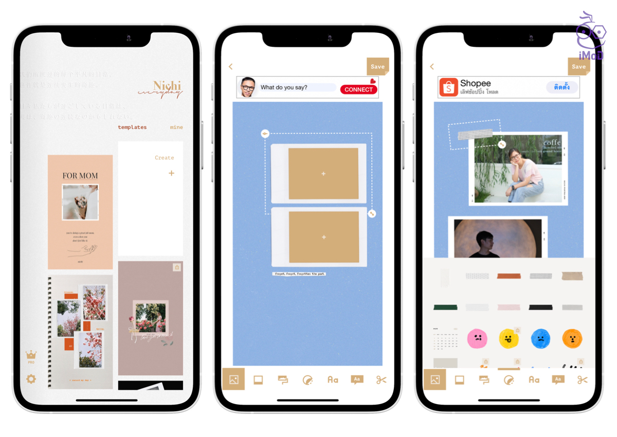 ภายในแอปจะมีเทมเพลตแนวญี่ปุ่น ออกแนวเอิร์ทโทนให้เราเลือกมากมาย มีทั้งเทมเพลตฟรีและไม่ฟรี สามารถใส่รูปภาพได้หลายรูป เราสามารถเลือกรูปภาพใส่ใสเทมเพลตสวย ๆ ได้เลย และตกแต่งด้วยสติกเกอร์น่ารัก ๆ ที่มีอยู่ในแอป