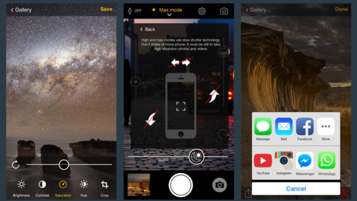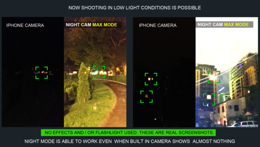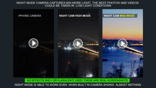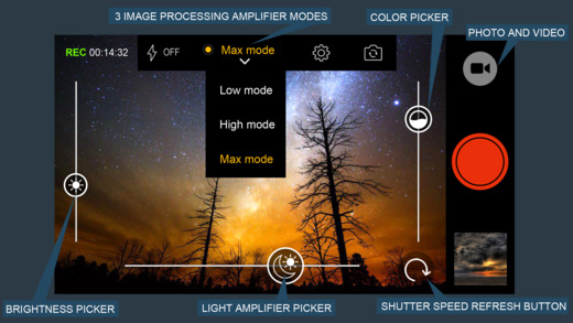 แอปกล้องถ่ายรูปและถ่ายวีดีโอตอนกลางคืน หรือในที่แสงน้อย ที่มาพร้อมกับการประมวลผลภาพ Amplifier 3 โหมดด้วยกัน ได้แก่ Low, High และ Max Mode ช่วยให้ความสว่างในการมองเห็นภาพในที่แสงน้อยได้ดีมากยิ่งขึ้นตามลำดับ สามารถปรับความสว่าง (Brightness), แสง (Light) และความอิ่มตัวของสี (Saturation) ได้ผ่านหน้าจออย่างง่ายดาย สามารถแก้ไขปรับแสง, สี, หรือตัดรูป (Crop) ภาพที่ถ่ายแล้วเพิ่มเติมได้ผ่านแอป แชร์รูปภาพในอัลบั้มผ่านแอปได้