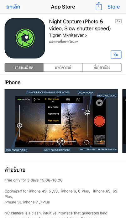 รีบโหลดก่อนหมดเวลา สำหรับแอปกล้องถ่ายรูปและถ่ายวีดีโอตอนกลางคืน หรือในที่แสงน้อย แอป Night Capture (Photo & video, Slow shutter speed) จากราคา $1.99 เปิดให้โหลดฟรี 3 วัน ถึงวันที่ 18 มิถุนายน 2560 มาเร่งขีดความสามารถของกล้อง iPhone ให้เสมือนเป็นกล้อง DSLR กันเถอะ (ใครที่ชอบถ่ายรูปตอนกลางคืนก็สามารถโหลดไปทดลองกันได้ครับ)