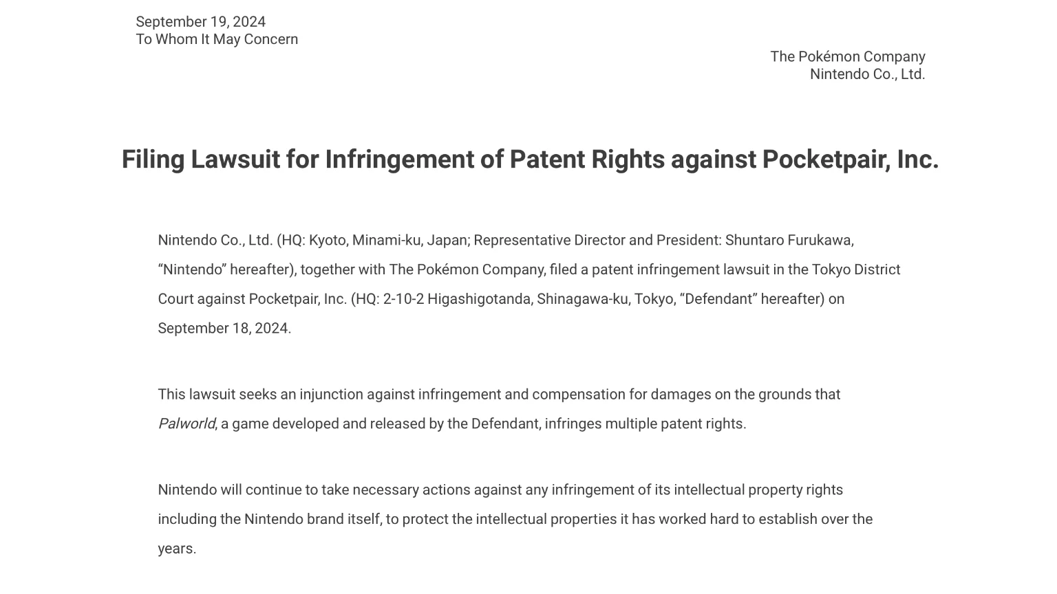 วันที่ 18 กันยายน 2024 บริษัท Nintendo และ The Pokémon Company ได้ยื่นฟ้องร้องเรื่องการละเมิดสิทธิบัตรต่อบริษัท Pocketpair, Inc. ผู้เป็นเจ้าของเกม Palworld ณ ศาลแขวงโตเกียว โดยมีเป้าหมายเพื่อเรียกร้องคำสั่งห้ามการละเมิดและการชดเชยค่าเสียหาย