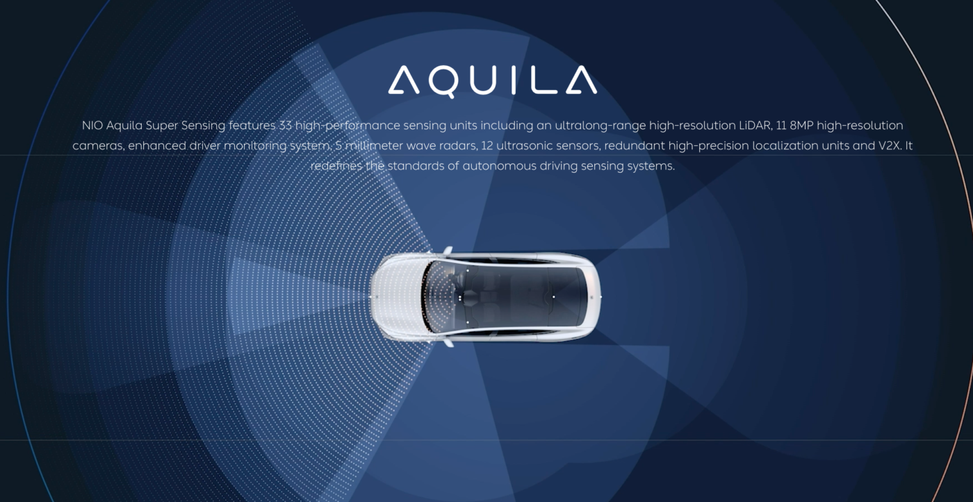จุดเด่นหลักที่น่าสนใจของรถ ET7 ก็คือ รอบๆ ตัวรถมีเทคโนโลยี LiDAR Sensor ที่ใช้ชื่อเทคโนโลนีว่า NIO Aquila Super Sensing ที่สามารถส่งสัญญาณเรดาห์ออกไปกระทบวัตถุรอบ ๆ ได้ไกลถึง 500 เมตร ซึ่งมีไว้ช่วยเหลือผู้ขับขี่ให้สะดวกและปลอดภัยมากยิ่งขึ้น ซึ่งรถ Tesla ของ Elon Musk ไม่ได้ใช้เทคโนโลยีนี้