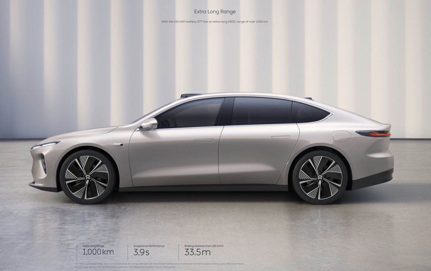 รถ ET7 จาก Nio เป็นรถไฟฟ้าที่ใช้พลังงานแบตเตอรี่ 150kWh ที่สามารถวิ่งได้สูงสุด 1,000 กิโลเมตร (621 ไมล์) ต่อการชาร์จแต่ละครั้ง กำลังรวมสูงสุดอยู่ที่ 650 แรงม้า สามารถเร่งความเร็วจาก 0-100 กม./ชม. ได้ในเวลาเพียง 3.9 วินาที และมีระยะเบรคที่ความเร็ว 100 กม./ชม. จนหยุดที่ 33.5 เมตร