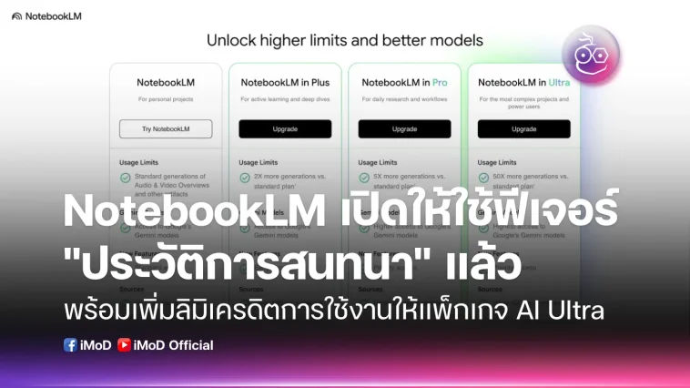 NotebookLM เปิดให้ใช้ฟีเจอร์ ประวัติการสนทนา และเพิ่มขีดจำกัดการใช้งานให้แพ็กเกจ AI Ultra
