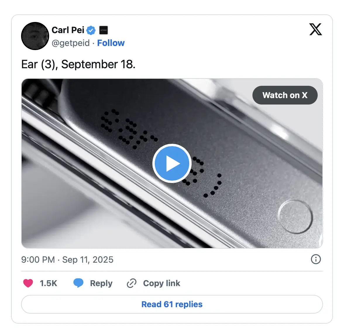 Nothing ได้เปิดเผยว่า Ear (3) จะเปิดตัวในวันที่ 18 ก.ย. โดยก่อนหน้างานประกาศอย่างเป็นทางการ บริษัทได้เผยรายละเอียดดีไซน์เต็มรูปแบบของหูฟังรุ่นใหม่นี้