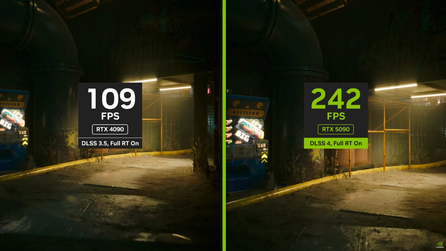 ในตัวอย่างมีการเปรียบเทียบระหว่าง RTX 5090 กับ RTX 4090 สาธิตผ่านเกม Cyberpunk 2077 โดย RTX 5090 DLSS 4 รันสูงสุดอยู่ที่ 238fps / RTX 4090 DLSS 3.5 GPU รันสูงสุดอยู่ที่ 106fps ทั้งสองตัวรันเกมโดยเปิดใช้งาน ray tracing เต็มรูปแบบ
