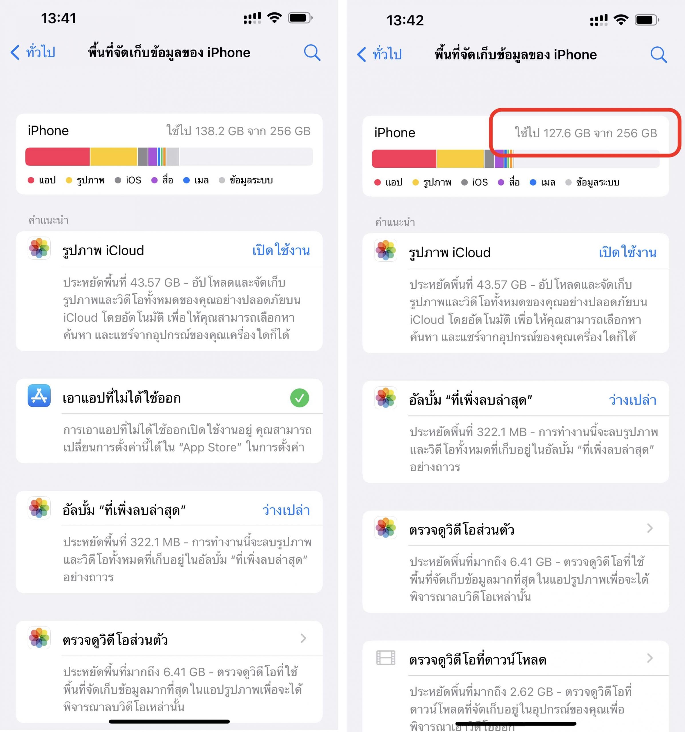 ปกติแล้ว เราสามารถเข้าดูรายการพื้นที่ข้อมูลของ iPhone ได้โดยไปที่ การตั้งค่า > ทั่วไป > พื้นที่จัดเก็บข้อมูลของ iPhone จากนั้นจะมีคำแนะนำเกี่ยวกับการจัดการพื้นที่ขึ้นมา