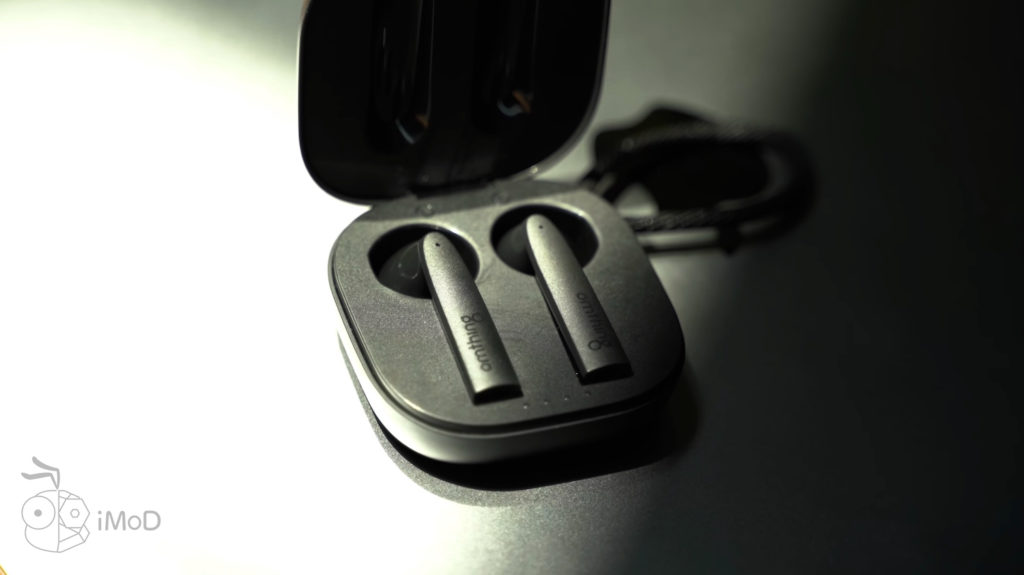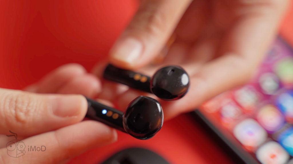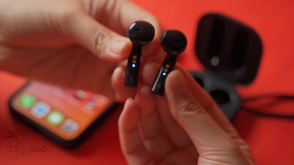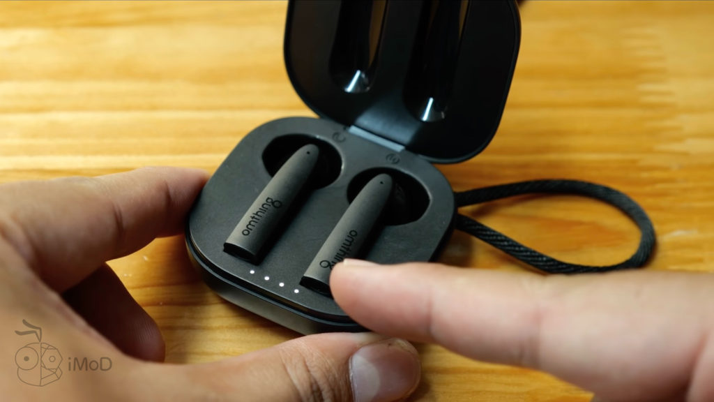 นำหูฟัง omthing AirFree Pods ทั้งสองข้างออกจากกล่องชาร์จก่อน จะเห็นว่ามีไฟ LED สีฟ้าและสีขาวกระพริบสลับกันที่หูฟังข้างหนึ่ง ซึ่งเป็นการเชื่อมต่อระหว่างหูฟังทั้งสองข้าง