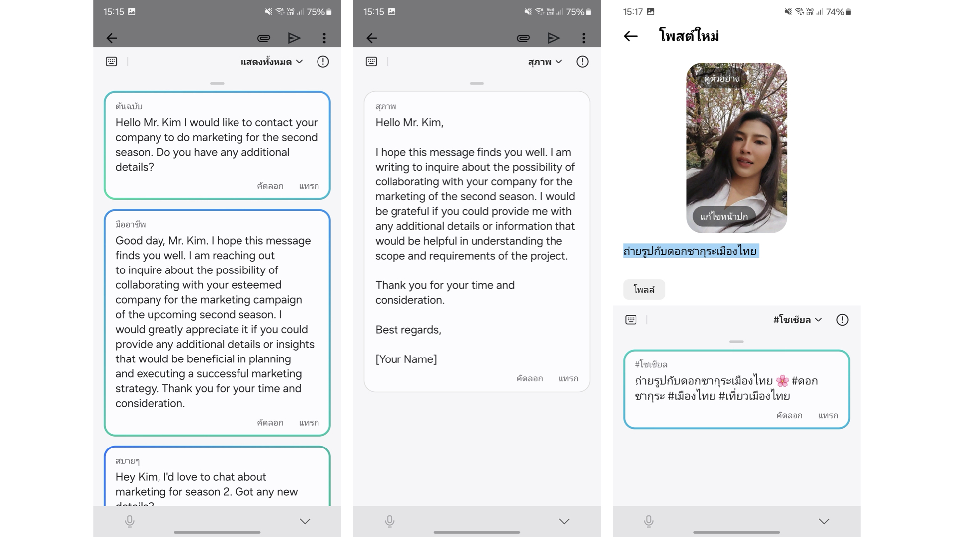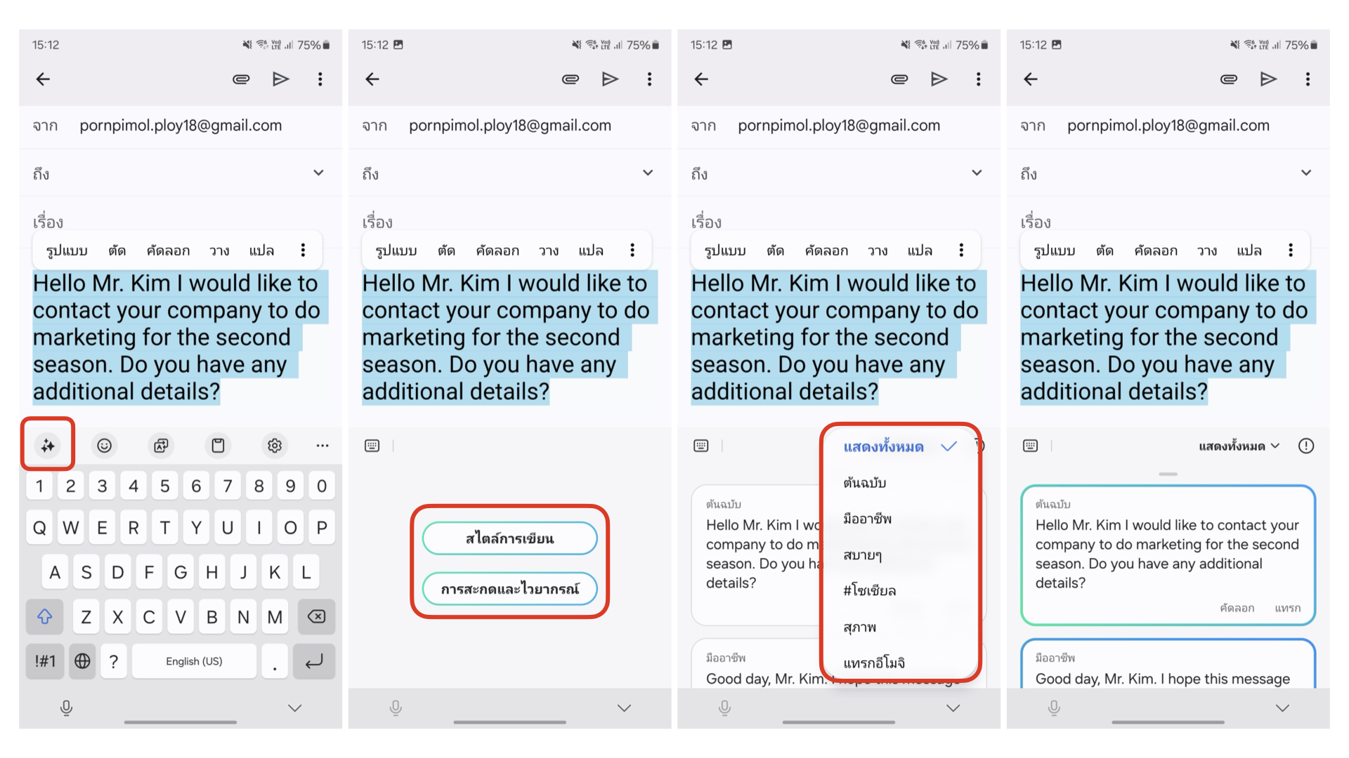 เลือกคลุมคำที่ต้องการปรับ > ปุ่ม AI บนแป้นพิมพ์ > เลือกสไตล์การเขียนแบบต่างๆ ได้แก่ Professional, Casual, #social, Polite, Emojify เป็นต้น