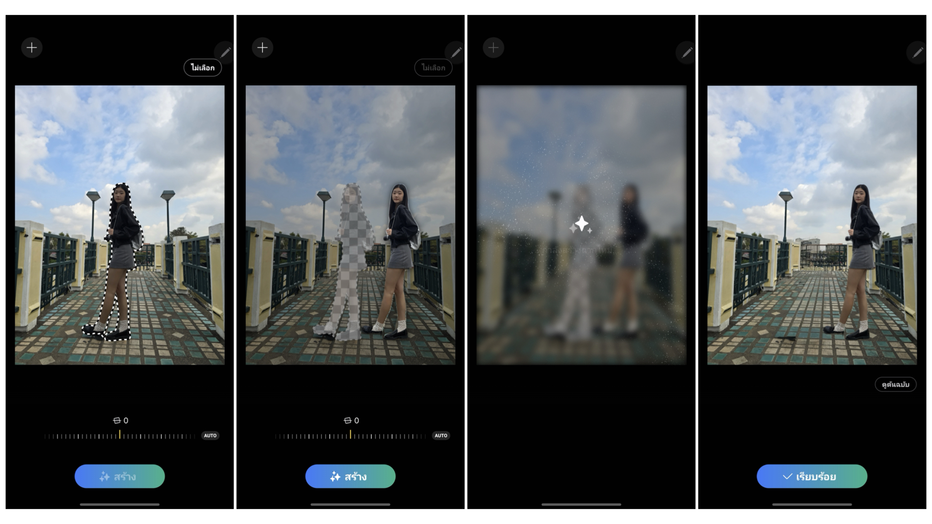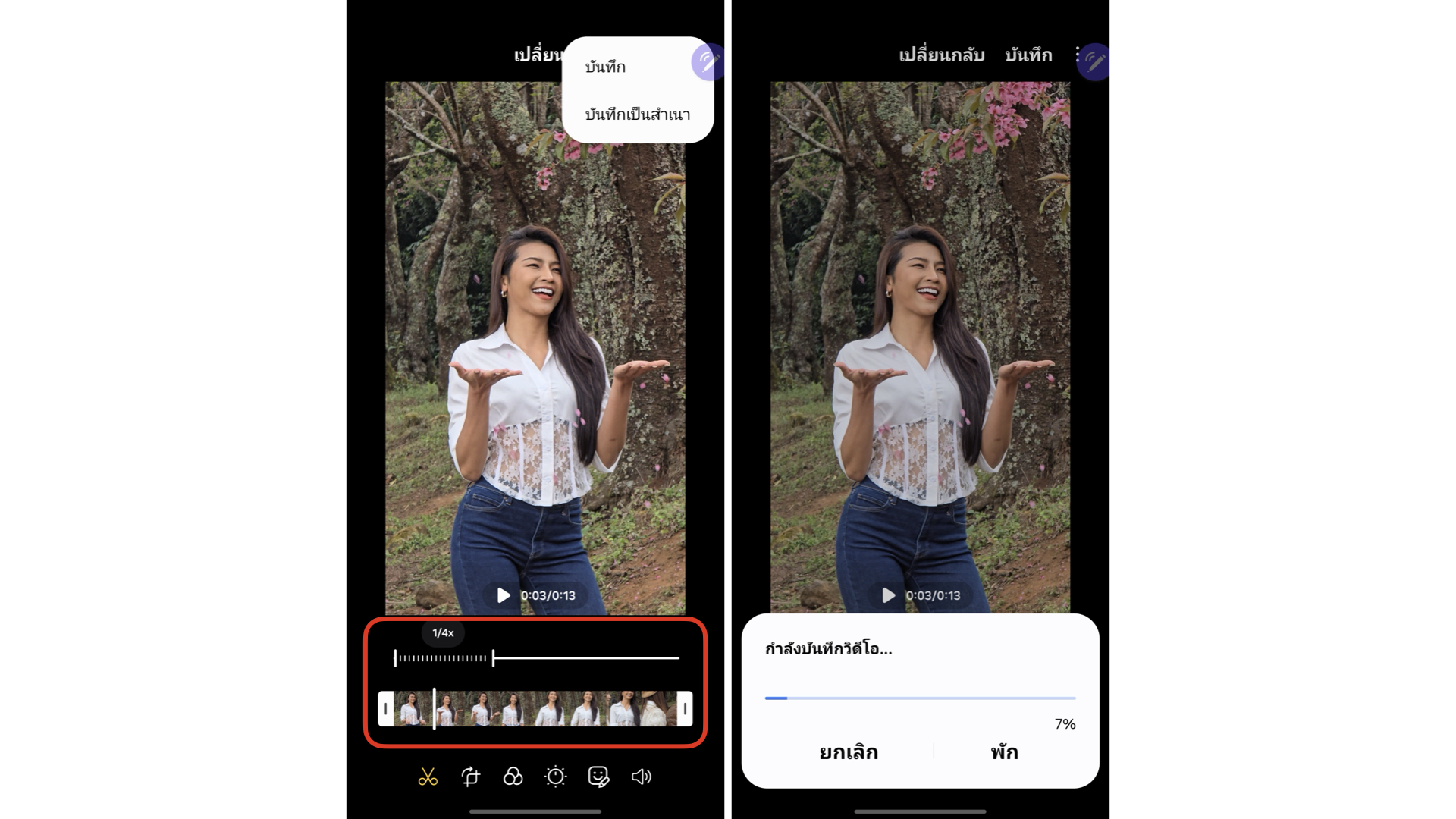 โหมดสโลว์โมชันทำได้เพียงแค่ใช้นิ้วแตะหน้าจอบนวิดีโอที่ดูพรีวิว > กดแก้ไข > เลือกความเร็ว + ระยะที่ต้องการทำโหมดสโลว์ > รอ AI ประมวลผล > บันทึกสำเนา เพียงเท่านี้ก็ได้วิดีโอสไลว์ในช่วงที่ต้องการแบบไม่ต้องย้ายไปตัดต่อแอปอื่น