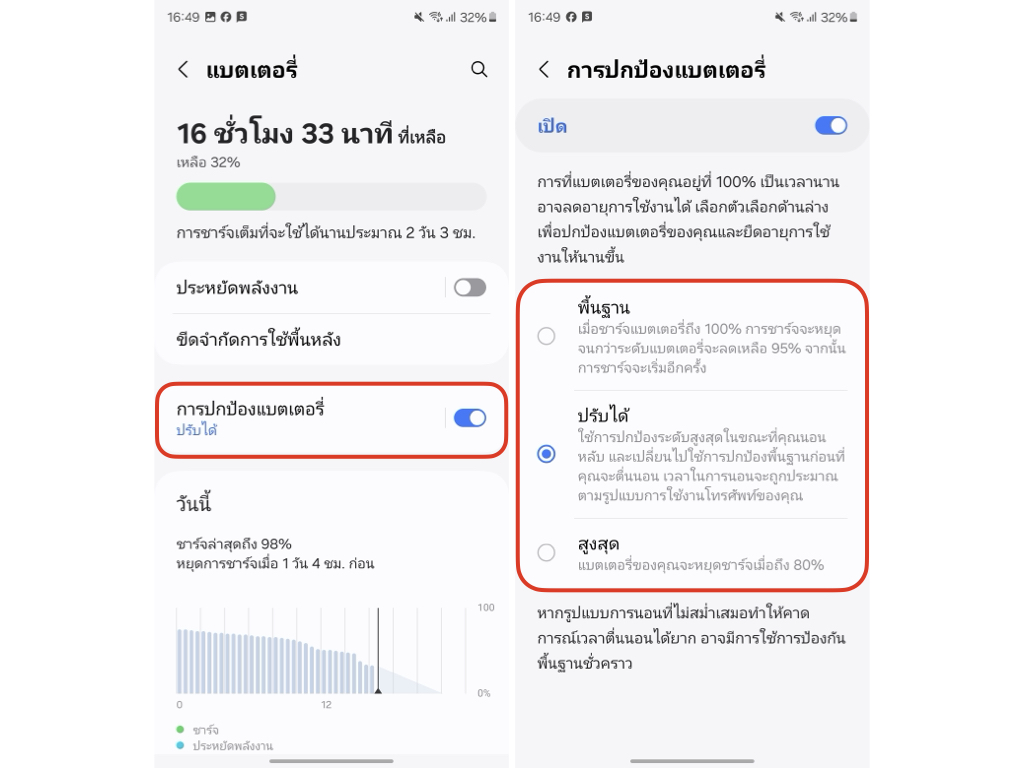 เพิ่มตัวเลือกการปกป้องแบตเตอรี่เมื่อชาร์จเต็ม 100% และปล่อยทิ้งไว้อาจทำให้แบตเตอรี่เสื่อมได้ ซึ่งสามารถเลือกตัวเลือกให้เข้ากับการใช้งานของเราได้