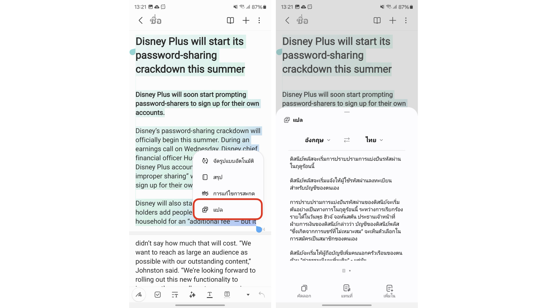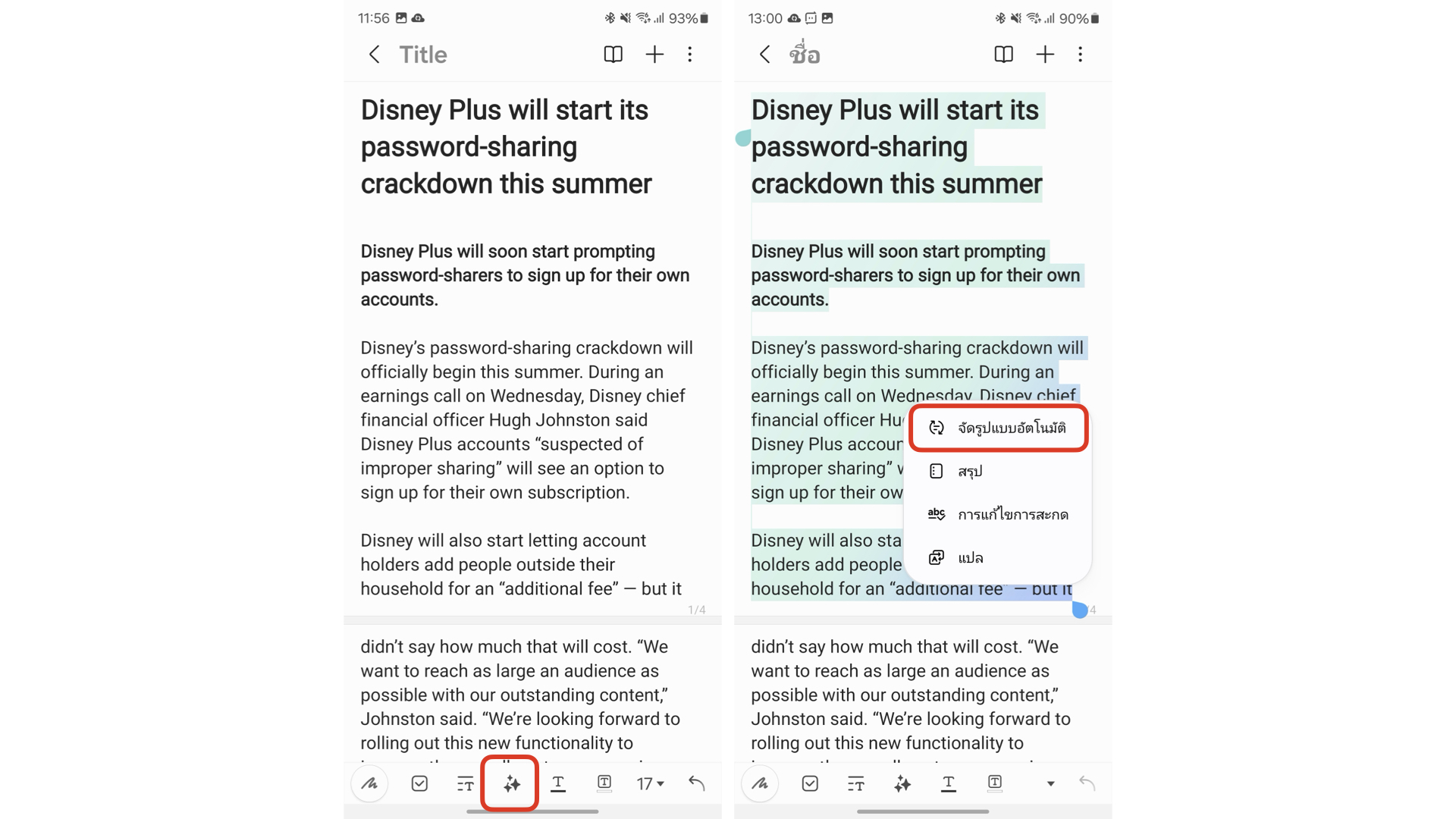 ใช้ AI เข้ามาช่วยอ่านบทความ จัดรูปแบบ และแปลภาษา โดยที่ไม่ต้องออกไปใช้งานแอปอื่นๆ วิธีการคือเข้าไปที่โน้ตที่ต้องการ แล้วแตะปุ่มดาว AI ด้านล่าง หลังจากนั้นจะมีเครื่องมือ AI แสดงขึ้นมาให้ใช้งาน โดยมีฟีเจอร์ดังนี้