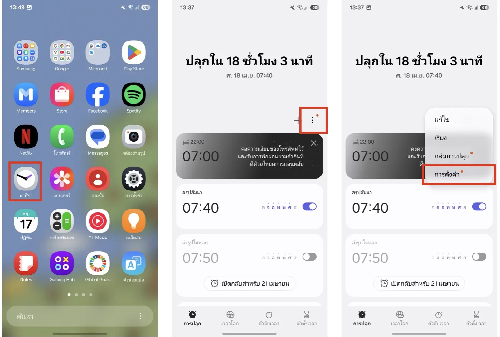 เปิดแอป นาฬิกา ของ Samsung > แตะ 3 จุด ด้านบนขวา > แตะ การตั้งค่า