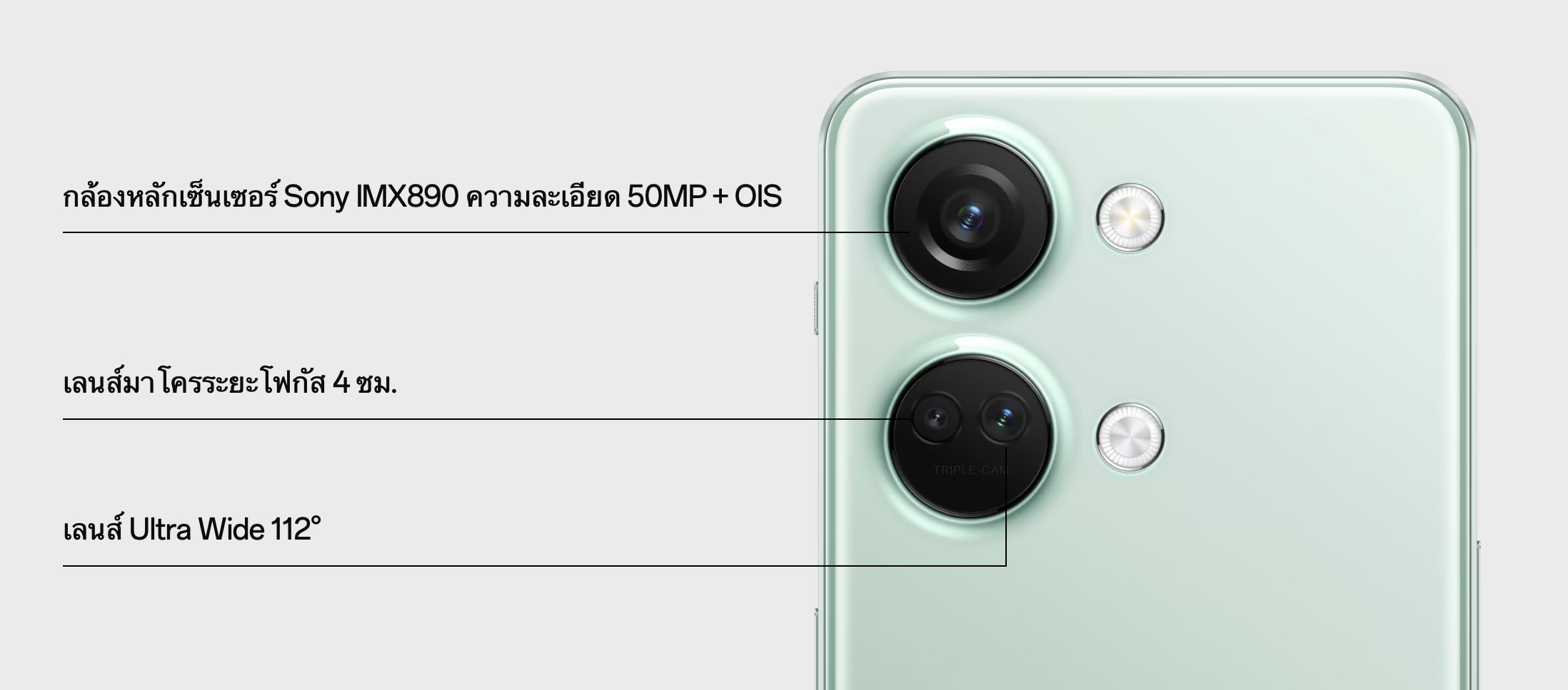 ด้านหลังมาพร้อมกับกล้อง 3 ตัว โดยแบ่งตำแหน่งแยกออกมาจากกล้องหลัก และ กล้อง Ultra-Wide / กล้อง Macro