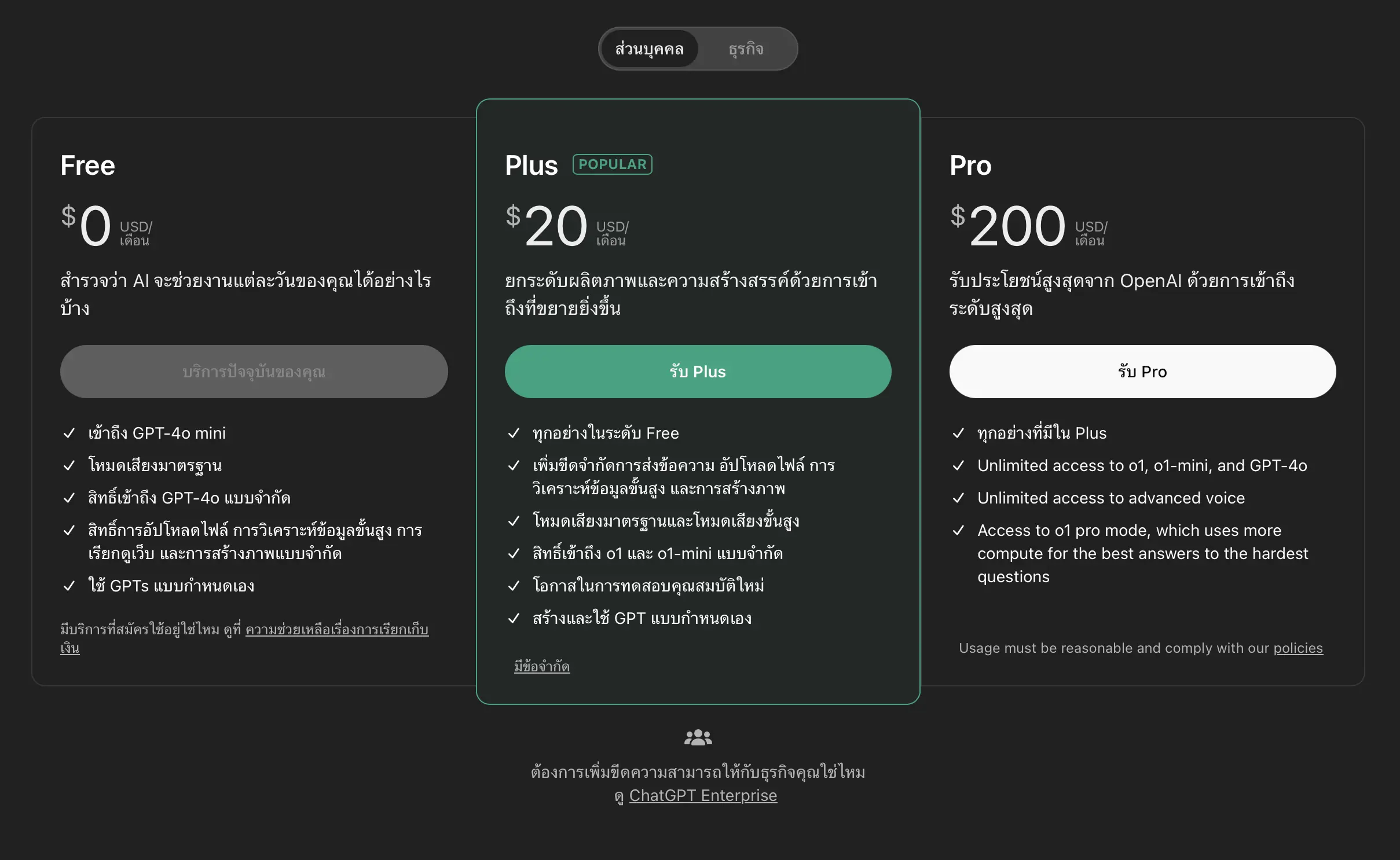แผน ChatGPT Pro นั้นผู้ใช้จะสามารถเข้าถึง OpenAI o1, o1-mini, GPT-4o ได้แบบไม่มีจำกัด, ใช้งานโหมดเสียงขั้นสูงได้ไม่จำกัด และยังสามารถใช้งานโหมด o1 Pro ที่จะประมวลผลคำสั่งที่ซับซ้อนมาก ๆ, ตอบคำถามจากปัญหาที่ยากสุดได้