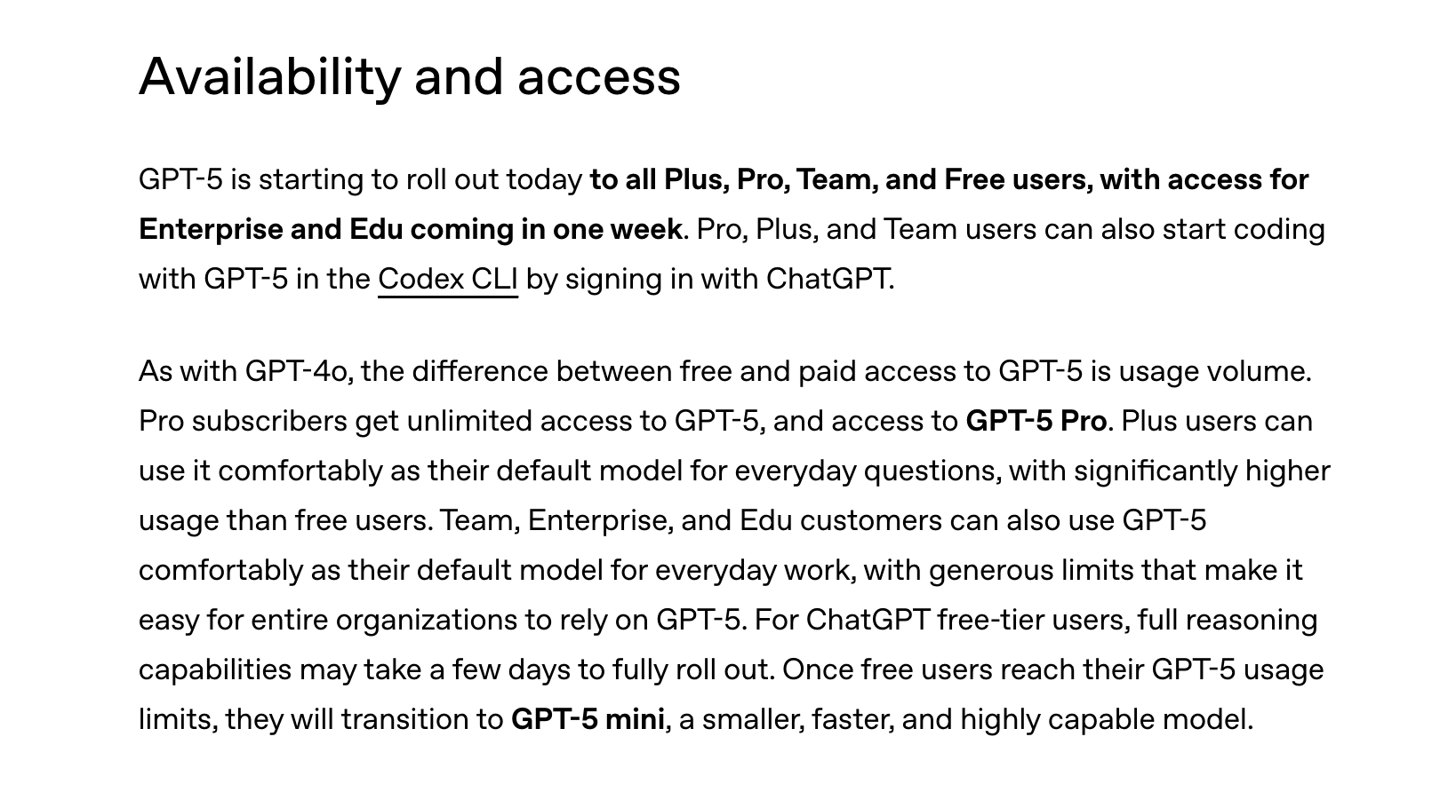 Free: จะเปิดให้ใช้งานหลังวันเปิดตัวอีก 2-3 วัน เมื่อใช้ ChatGPT-5 ถึงขีดจำกัดระบบจะเปลี่ยนให้ใช้ ChatGPT-5 mini รุ่นที่ขนาดเล็กกกว่า เร็วกว่า แต่ประสิทธิภาพสูง