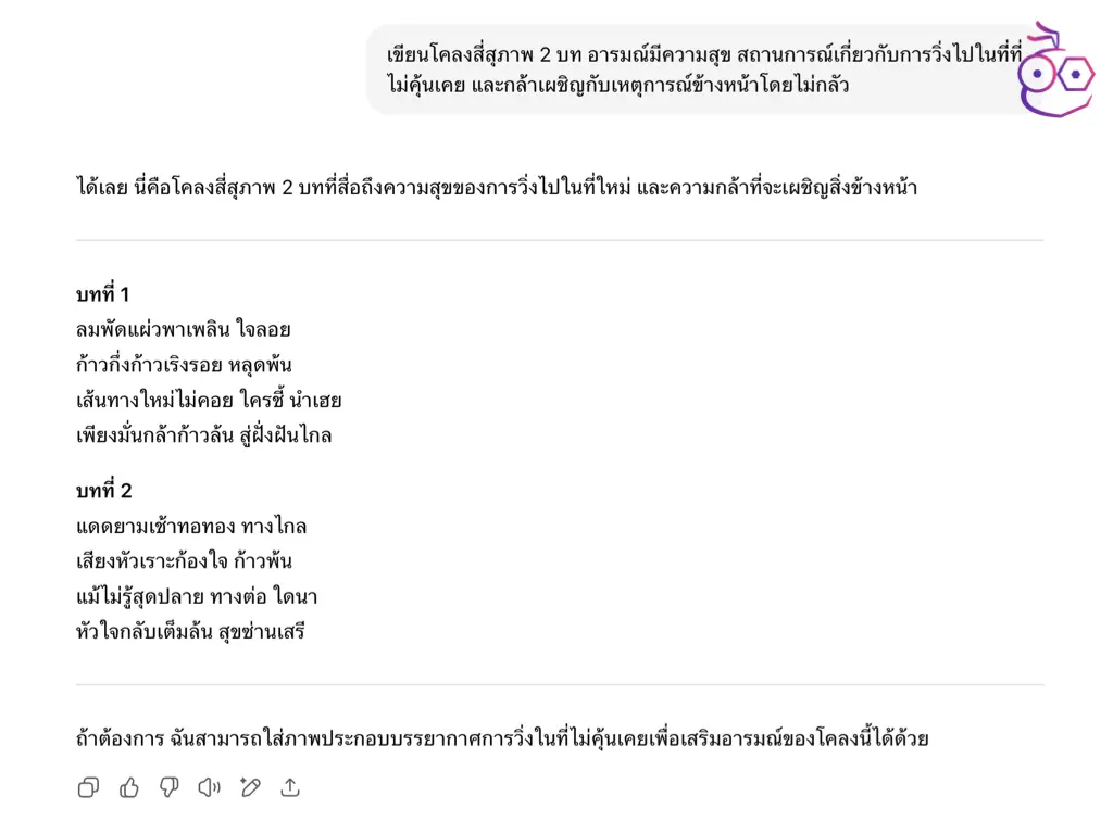Prompt: เขียนโคลงสี่สุภาพ 2 บท อารมณ์มีความสุข สถานการณ์เกี่ยวกับการวิ่งไปในที่ที่ไม่เค้นเคย และล้าเผชิญกับเหตุการณ์ข้างหน้าโดยไม่กลัว