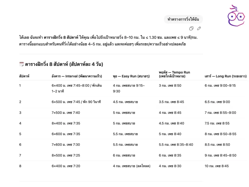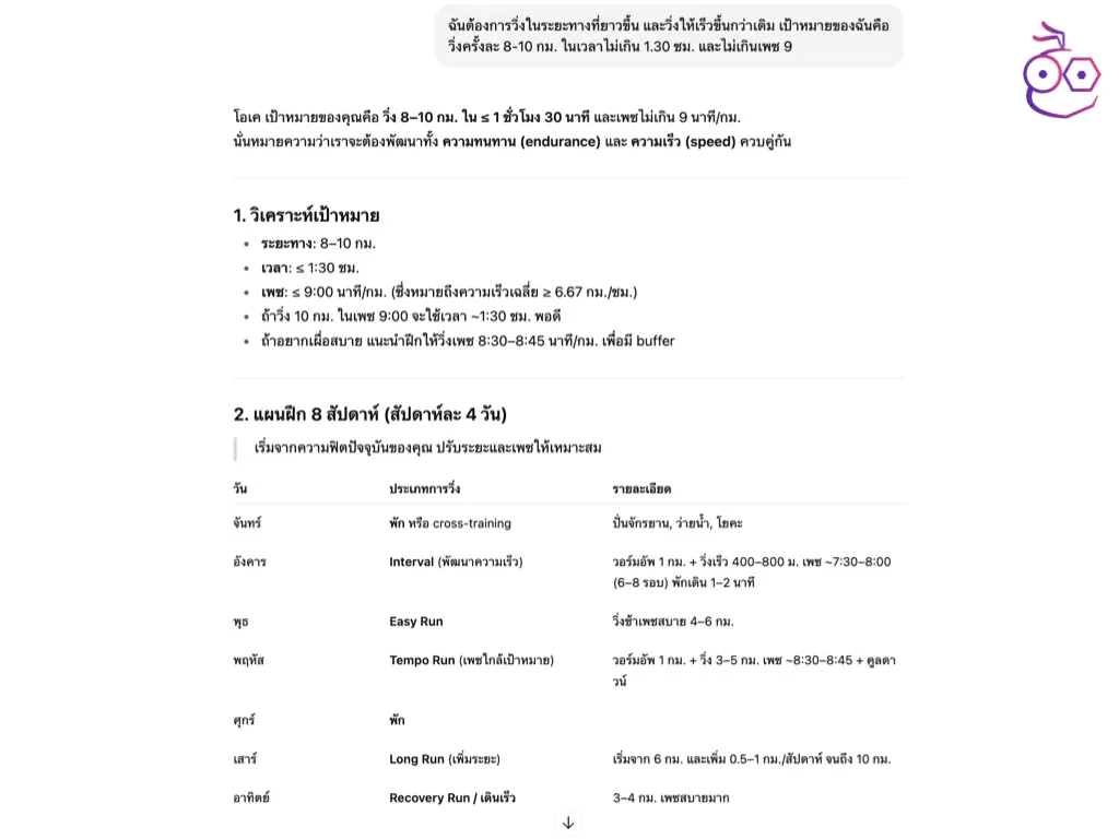 Prompt: ฉันต้องการวิ่งในระยะทางที่ยาวขึ้น และวิ่งให้เร็วขึ้นกว่าเดิม เป้าหมายของฉันคือวิ่งครั้งละ 8-10 กม. ในเวลาไม่เกิน 1.30 ชม. และไม่เกินเพซ 9