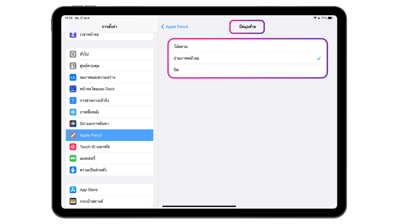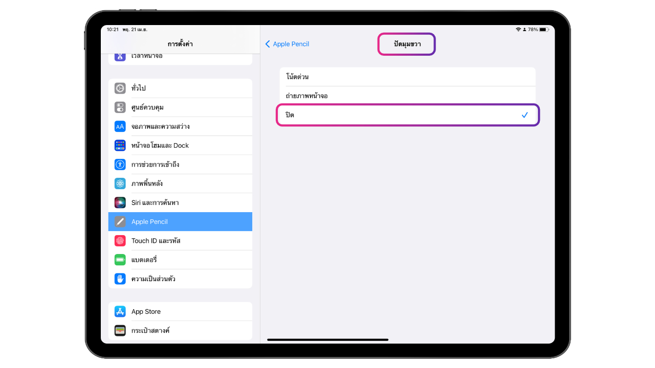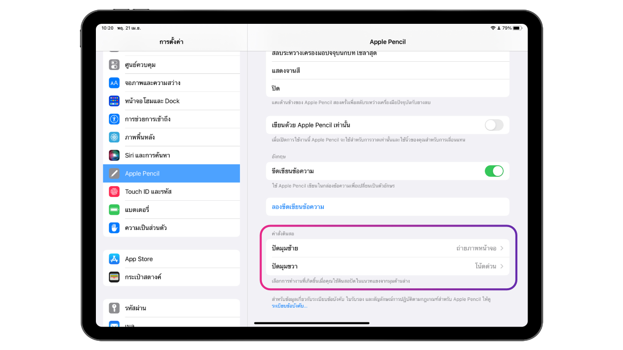 ไปที่การตั้งค่า > Apple Pencil > เลื่อนลงมาที่เมนูคำสั่งดินสอ จะมีตัวเลือก “ปัดมุมซ้าย” และ “ปัดมุมขวา” ซึ่งเราสามารถเลือกตั้งค่าคำสั่งดินสอได้เลย
