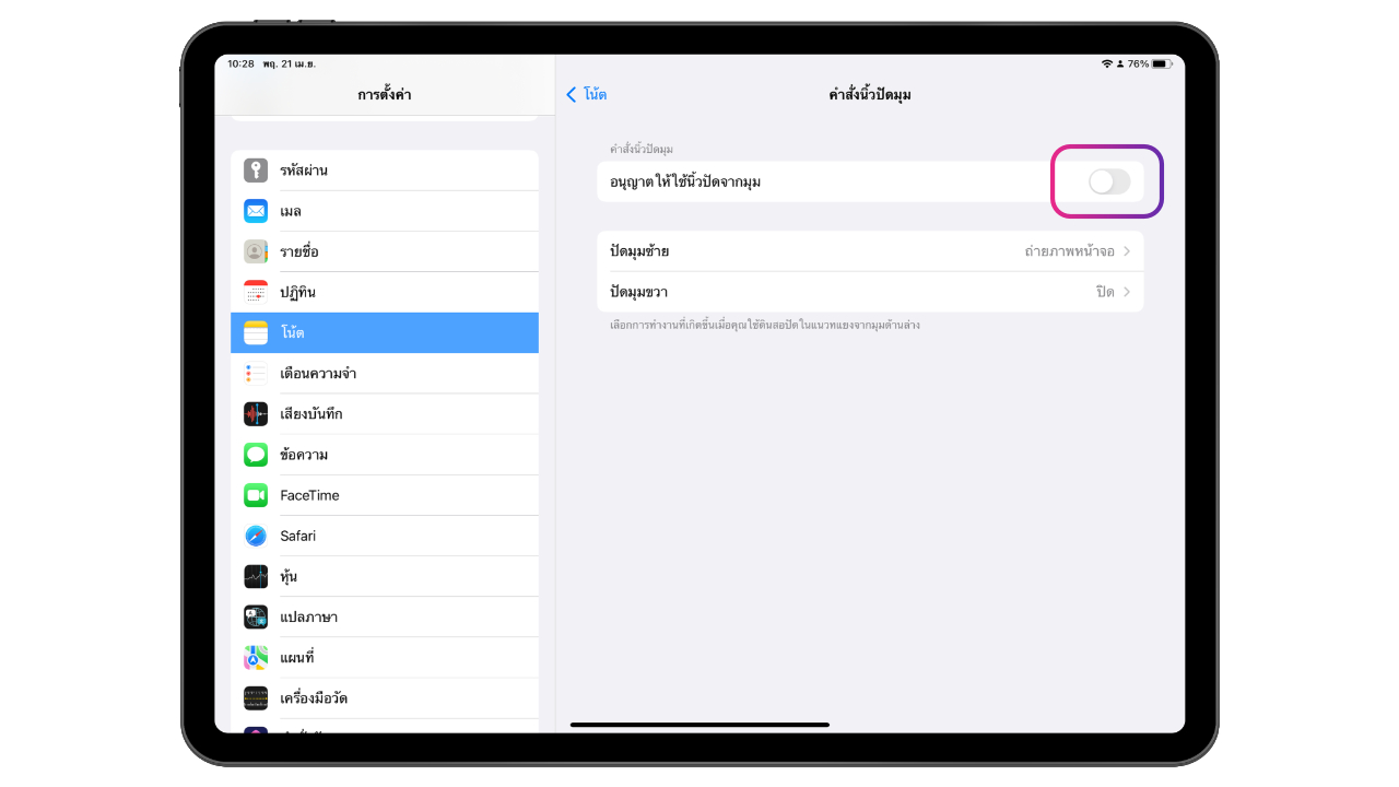 หรือสามารถตั้งค่าได้อีกหนึ่งวิธี โดยไปที่การตั้งค่า > โน๊ต (Note) > เลื่อนลงมาที่เมนูโน๊ดด่วน > เลือก “คำสั่งนิ้วปัดมุม” > เลื่อน “ปิด” เมนูอนุญาตให้ใช้นิ้วปัดจากมุม