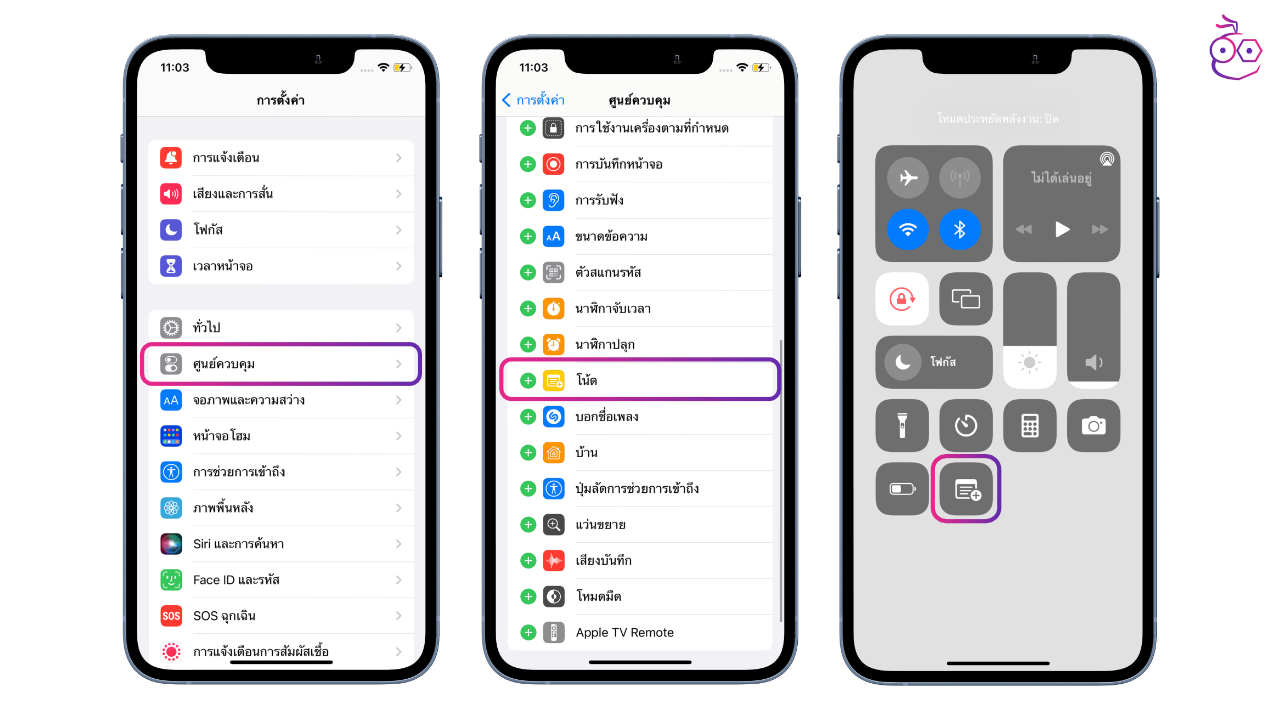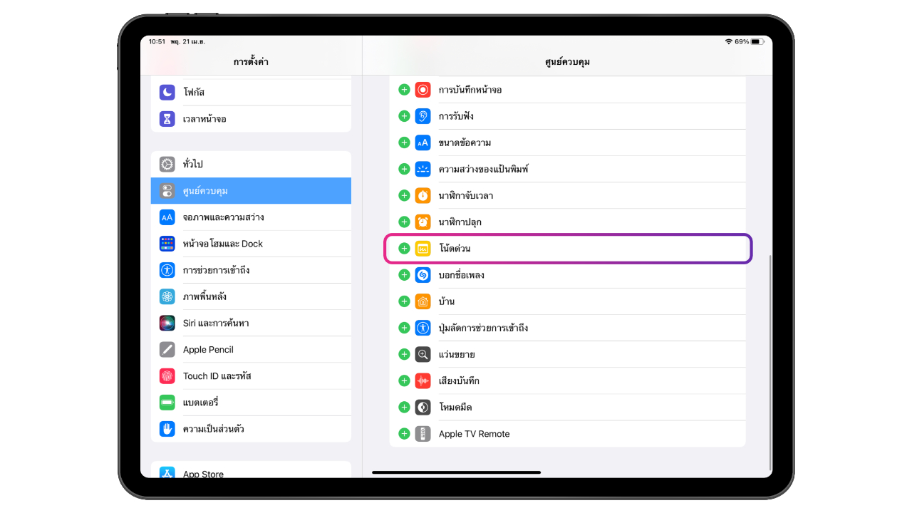 ใครที่ยังต้องใช้งาน Quick Note อยู่ แต่ไม่อยากเรียก Quick Note ด้วยการใช้นิ้วปัดจากมุม ก็ยังสามารถตั้งค่าให้ Quick Note เข้าผ่าน Control Center ได้ โดยไปตั้งค่าที่ การตั้งค่า > ศูนย์ควบคุม (Control Center) > เลือกไอคอน โน้ตด่วน (Quick Note)
