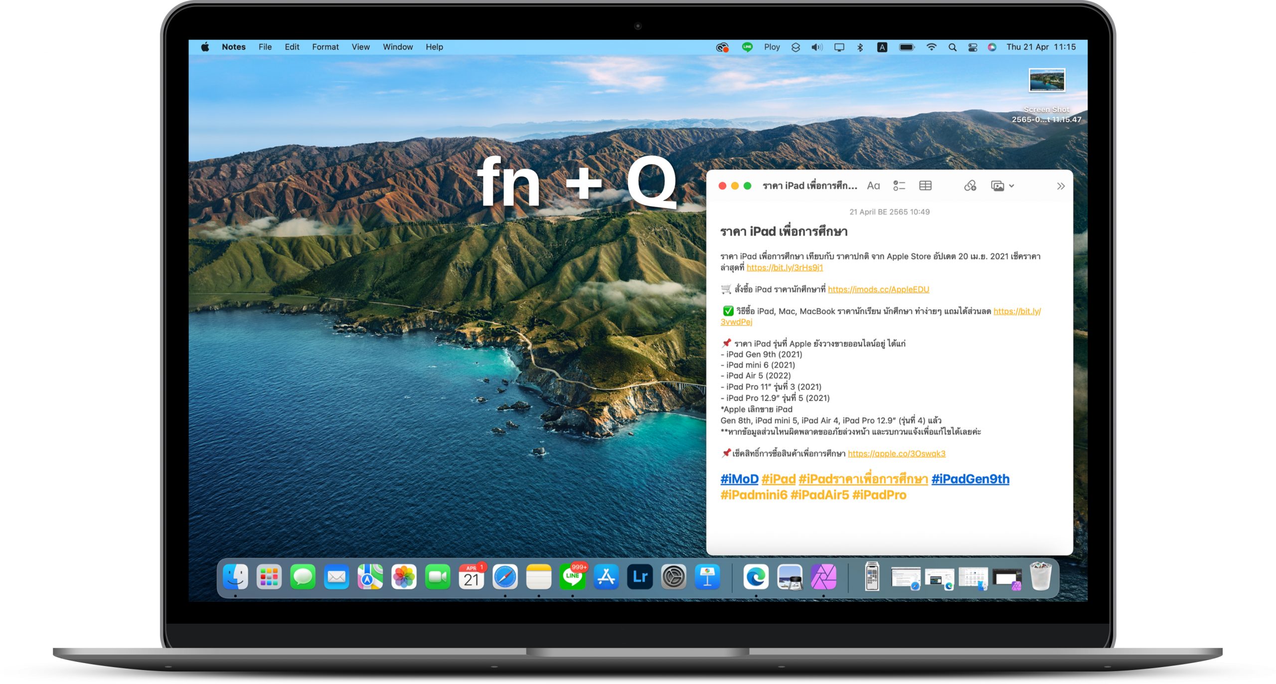 นอกจากการใช้งาน Quick Note บน iPad, iPhone แล้ว ก็ยังรองรับการใช้งานบน Mac ด้วยเช่นกัน เมื่อเรากำลังใช้งานแอปอื่น ๆ อยู่ แล้วอยากจะเปิดโน้ตขึ้นมาจดไอเดีย ก็สามารถกดปุ่ม Fn + Q เพื่อเรียกโน้ตขึ้นมา