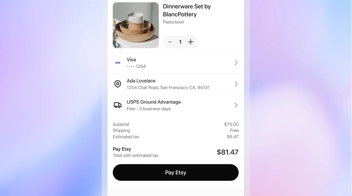 สามารถค้นหาสินค้าที่ตรงกับความต้องการของผู้ใช้ได้ และหากสินค้านั้นมาจาก Etsy หรือร้านค้าที่ใช้ระบบของ Shopify ก็จะสามารถสั่งซื้อผ่าน ChatGPT ได้เลย สินค้าที่รองรับ Instant Checkout จะมีปุ่ม ‘Buy’ (ซื้อ) แสดงขึ้นมา ซึ่งผู้ใช้งานสามารถชำระเงินด้วยบัตรที่ผูกไว้กับบัญชี หรือใช้ช่องทางการชำระเงินอื่น ๆ ได้