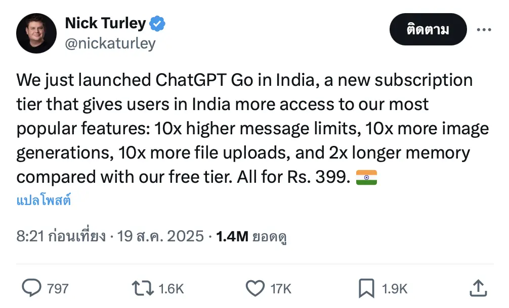 และเขาได้กล่าวใน X อีกว่า “เรากำลังเริ่มเปิดตัว Go ในอินเดีย และจะรับฟังความคิดเห็นของผู้ใช้ก่อนขยายไปยังประเทศอื่นๆ แผนนี้ให้ เพิ่มจำกัดของการพิมพ์ข้อความ, การสร้างภาพ และการอัปโหลดไฟล์ มากขึ้น 10 เท่า เพิ่มความหน่วยจำ มากขึ้น 2 เท่า เมื่อเทียบกับแผนฟรี ทั้งหมดนี้ราคาเพียง ₹399/เดือน”
