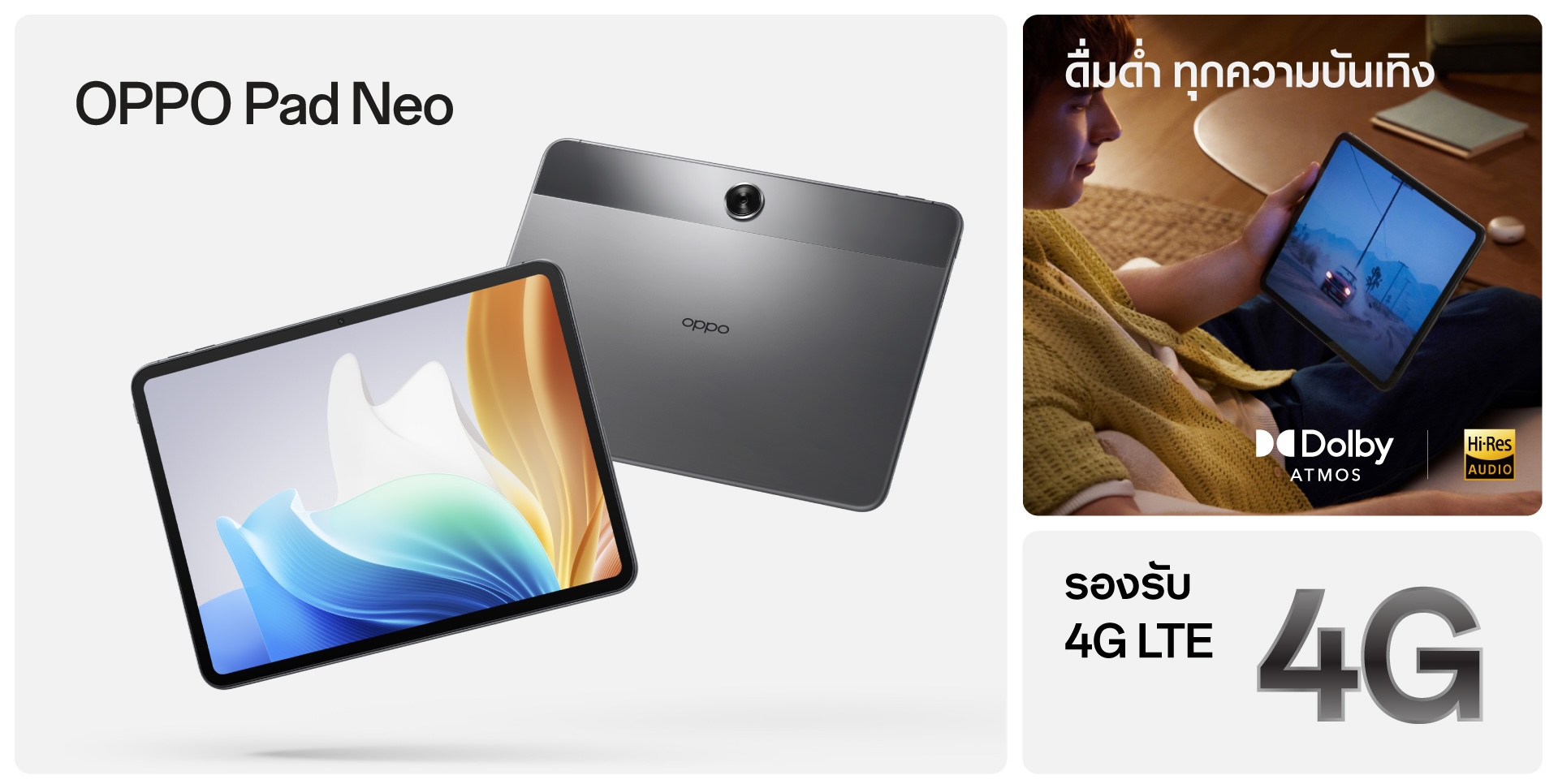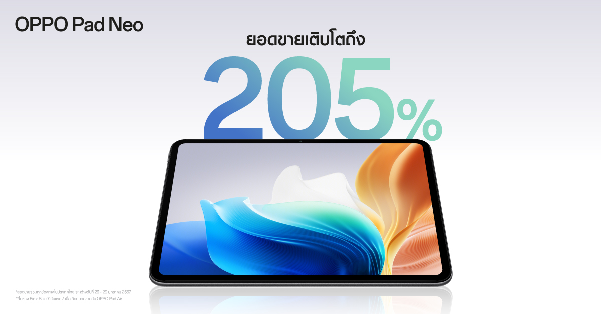 เปิดตัวแรง ยอดขายพุ่งกระฉูด! OPPO Pad Neo แท็บเล็ตรุ่นใหม่ให้จอยทุกความสนุกเหนือระดับ จัดเต็มทั้งหน้าจอขนาดใหญ่ 11.4 นิ้ว และลำโพง 4 ตัว ในราคา 10,990 บาท ได้รับกระแสตอบรับที่ดีเกินคาดทั้งจากสื่อมวลชน ลูกค้าและตัวแทนจำหน่ายหลังเปิดตัวอย่างเป็นทางการ โดยวางจำหน่ายในราคา 10,990 บาท เป็นเจ้าของได้แล้ววันนี้ ที่ OPPO Brand Shop และตัวแทนจำหน่ายทั่วประเทศ