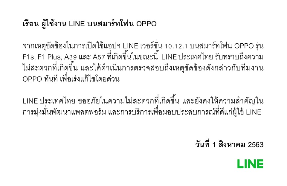 LINE ได้ประกาศผ่านแฟนเพจ LINE Thailand – Official สำหรับปัญหาที่เกิดขึ้นกับผู้ใช้สมาร์ตโฟน OPPO รุ่น F1s, F1 Plus, A39 และ A57 ที่ไม่สามารถเปิดใช้งานแอป LINE ได้ขณะนี้ ซึ่งเป็นเวอร์ชัน 10.12.1