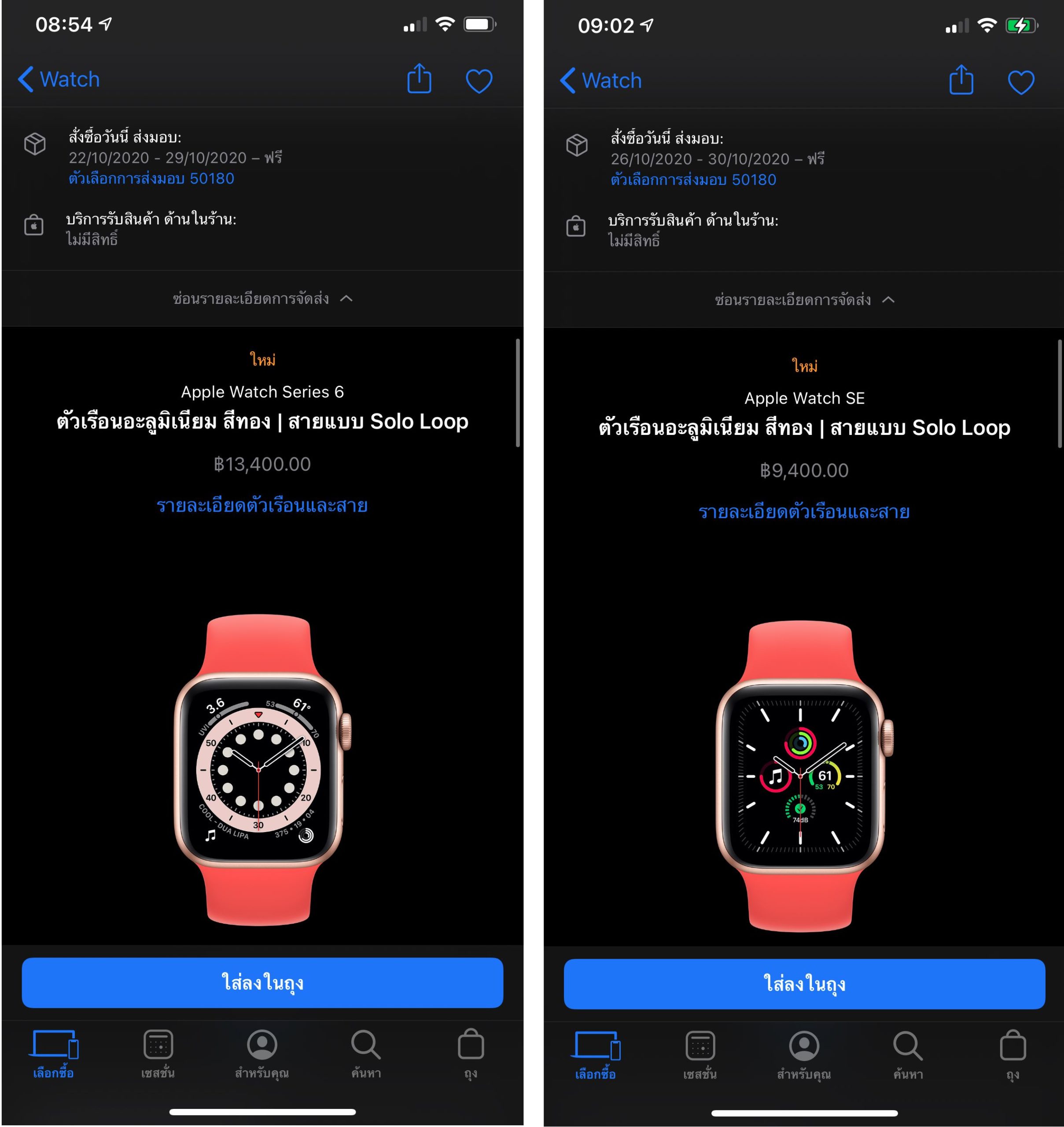 เมื่อทดลองกดซื้อ Apple Watch Series 6, Apple Watch SE พร้อมสาย Solo Loop, Braided Solo Loop พบว่าจะได้รับสินค้าช่วงปลายเดือน ต.ค.