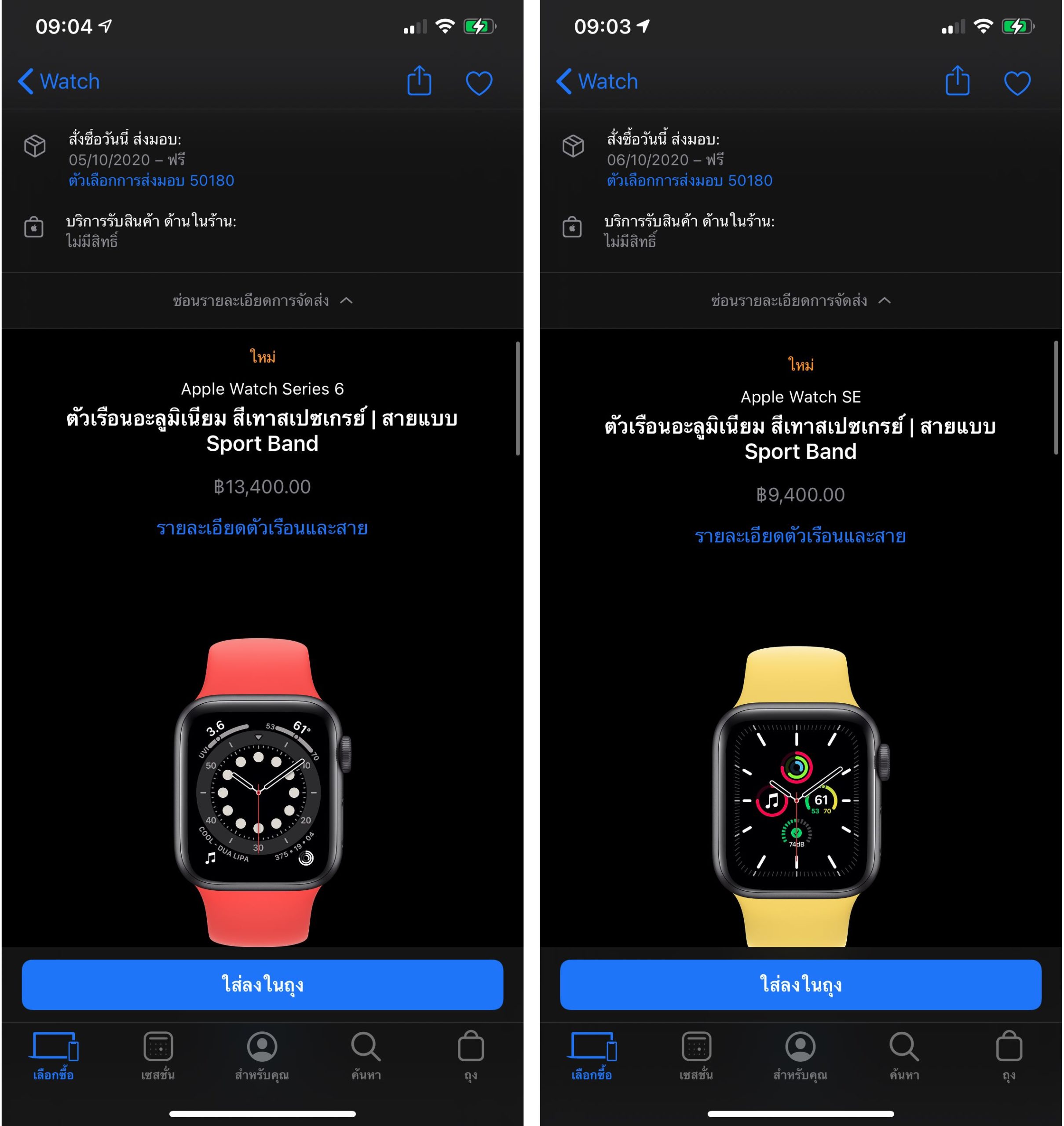 แต่เมื่อทดลองกดซื้อ Apple Watch Series 6, Apple Watch SE พร้อมสาย Sport Band พบว่ารอรับของไม่กี่วัน ต้นเดือน ต.ค. ก็ได้แล้ว