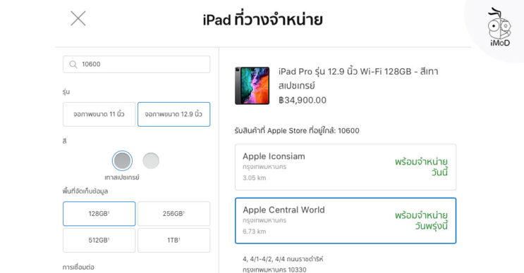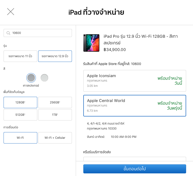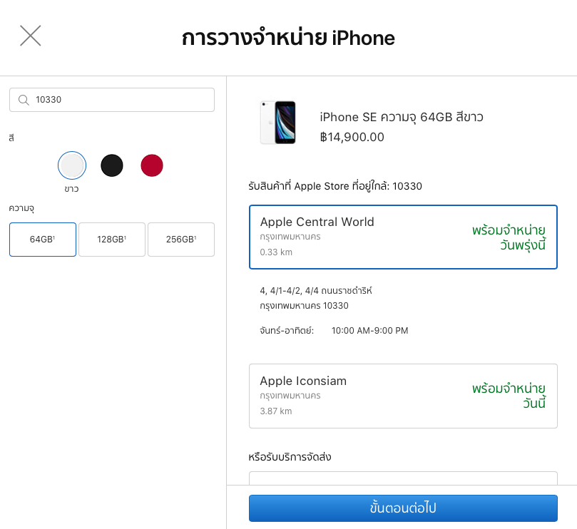 หลังจากที่ตรวจสอบพบว่า (1 สิงหาคม 2020) หากกดสั่งซื้อสินค้าวันนี้ จะสามารถไปรับสินค้าที่ Apple Central World ได้ในวันถัดไป