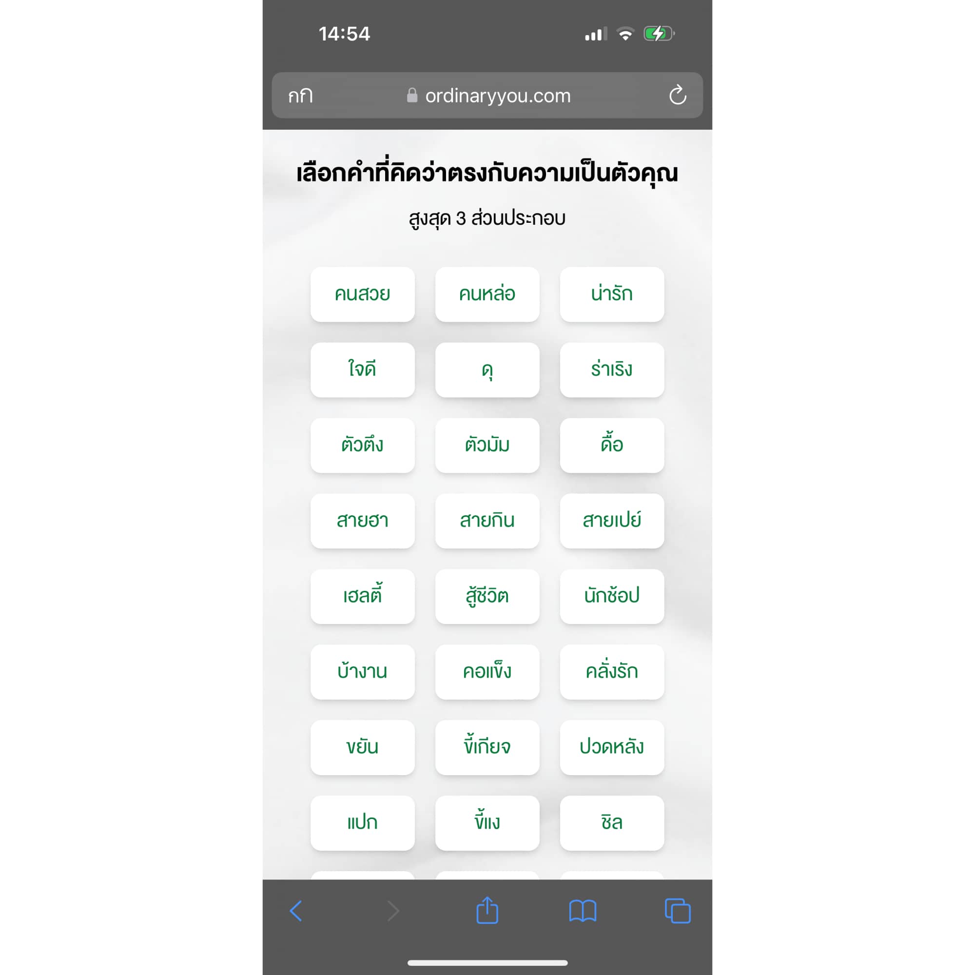 จากนั้นกด ไปต่อ จะมีคำถามและตัวเลือกต่าง ๆ มาให้เลือกว่าเราชอบหรือไม่ชอบตัวเองในนิสัยไหนบ้าง