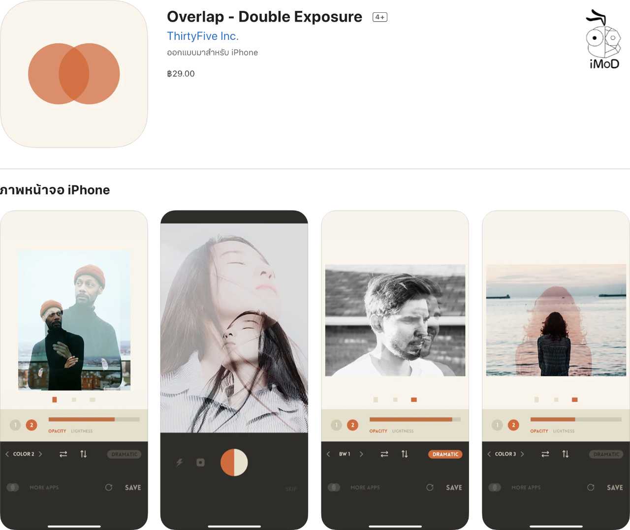 แอป Overlap – Double Exposure นั้นมีเครื่องมือไม่เยอะ มีวัตถุประสงค์ชัดเจน คือ เน้นไปที่การทำรูปภาพแบบ Double Exposure เพียงอย่างเดียว ดังนั้นจึงง่ายต่อการใช้งานมาก โดยตัวแอปมีราคาอยู่ที่ 29 บาทครับ