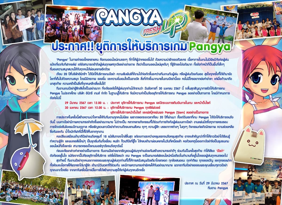 - 29 มีนาคม 2567 เวลา 12.00 น. : ประกาศ: ยุภิการให้บริการเกม Pangya และปิดระบบการเติมเงินภายในเกม และหน้าเว็บไซต์