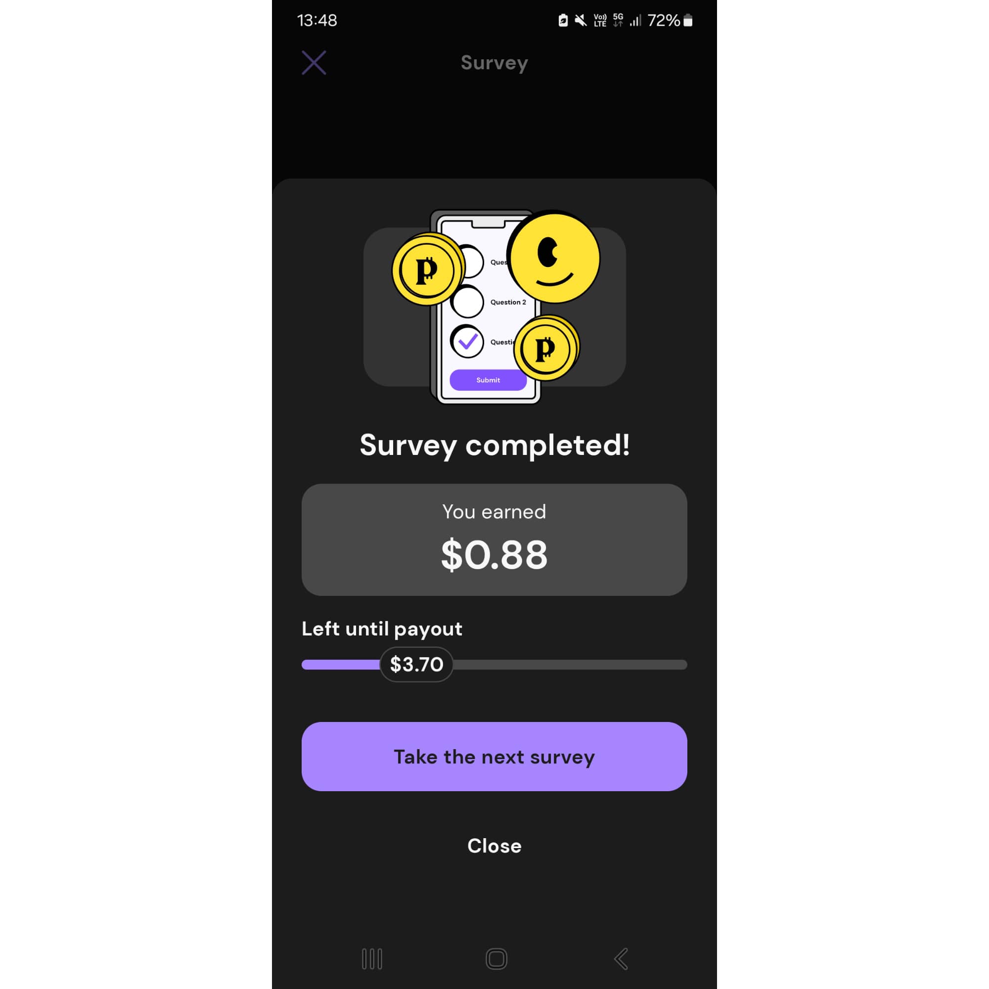 พอทำเราทำแบบสอบถามเสร็จและถูกต้องตามที่แบบสอบถามต้องการ ก็จะขึ้นแบบนี้ พร้อมได้รับเงินทันที