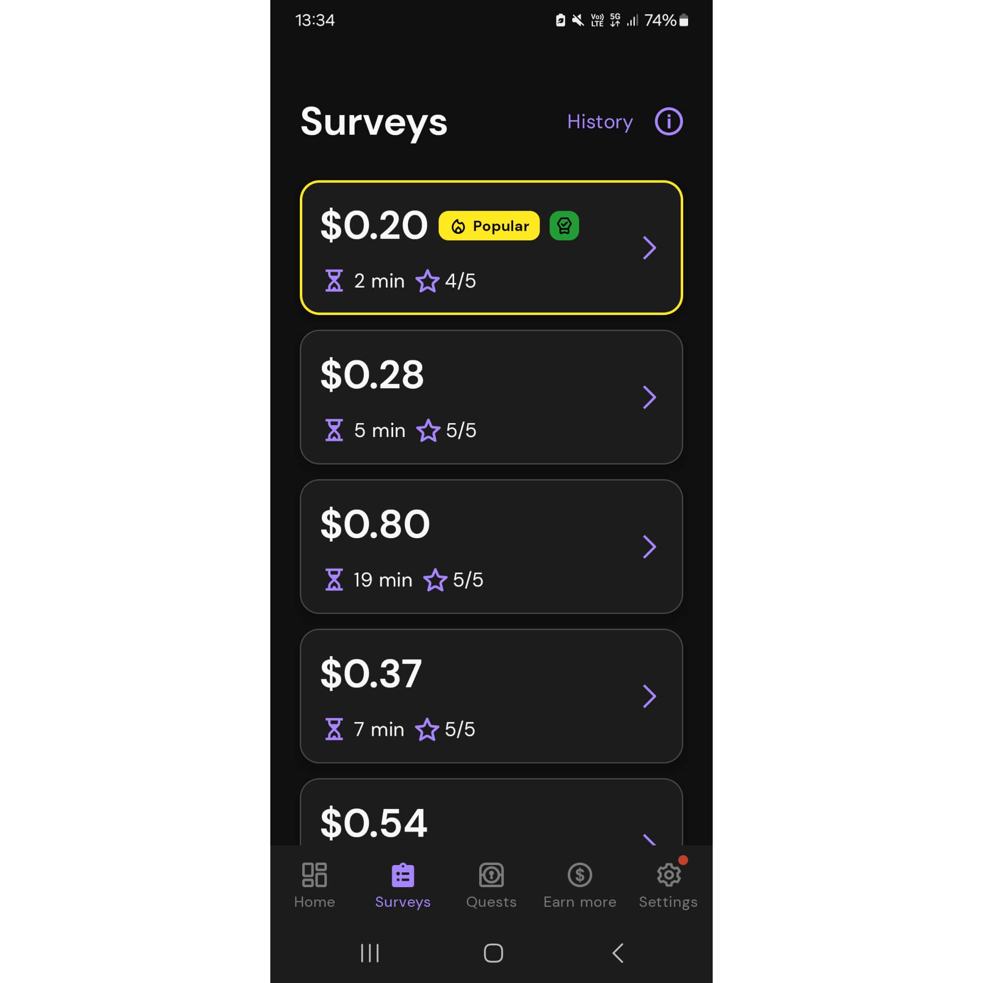 จากนั้นพอสมัครเสร็จตัวแอปก็จะมีแบบสอบถามให้เราเลือกทำเพียบ ซึ่งแต่ละอันได้เงินไม่เท่ากันและใช้เวลาในการทำแตกต่างกันด้วย