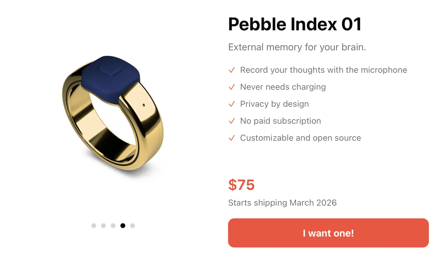 Pebble ได้ประกาศเปิดตัว Pebble Index 01 ซึ่งเป็นสมาร์ทริงแบบเรียบง่ายที่ออกแบบมาเพื่อการบันทึกข้อมูลโดยเฉพาะ โดยอุปกรณ์นี้มาพร้อมไมโครโฟนและปุ่มสำหรับเริ่มการบันทึกเสียง และไม่มีฟีเจอร์เพิ่มเติมอื่น ๆ มากนัก