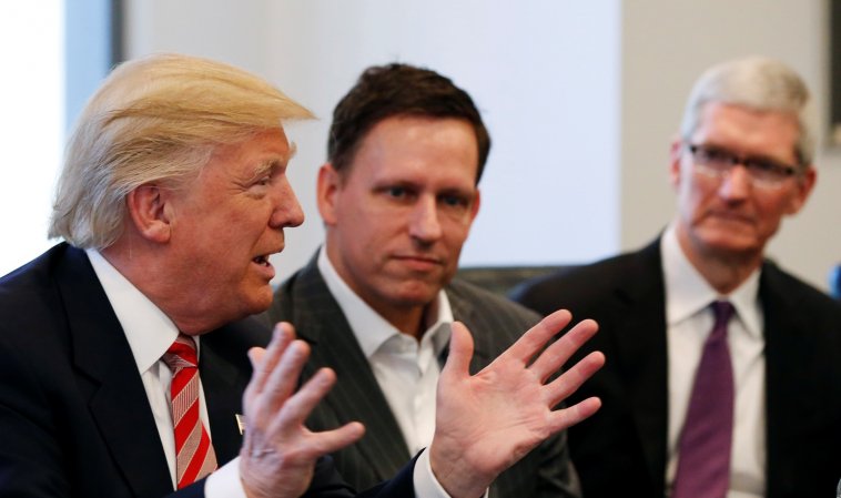 U.S. President-elect Donald Trump speaks as PayPal co-founder and Facebook board member Peter Thiel (C) and Apple Inc CEO Tim Cook look on during a meeting with technology leaders at Trump Tower in New York U.S., December 14, 2016. REUTERS/Shannon Stapleton - RTX2V25H