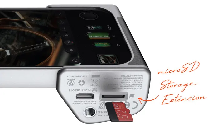 Phone Grip ไม่เพียงเพิ่มลุคกล้องวินเทจให้กับ iPhone แต่ยังมีปุ่มควบคุมจริงให้ปรับค่ากล้องได้สะดวกขึ้น รวมถึงมีช่องใส่ microSD ให้ด้วย
