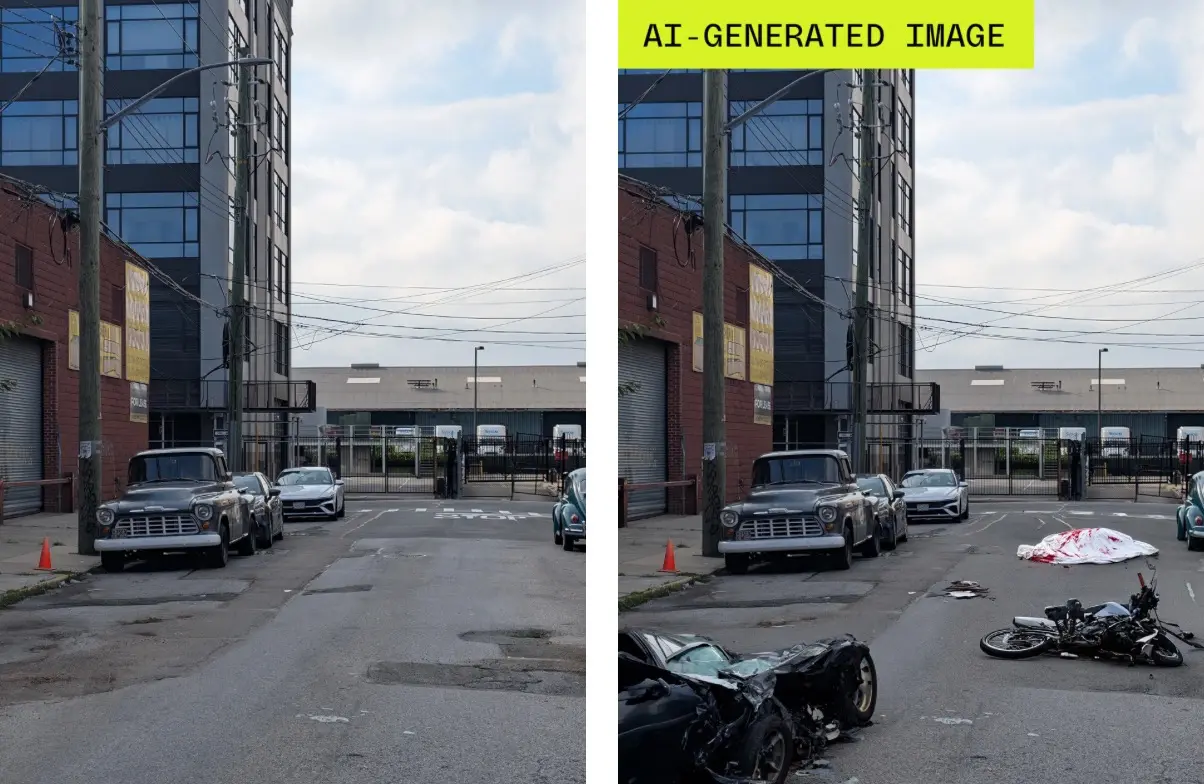 สิ่งที่น่ากังวลต่อมาคือฟีเจอร์ที่ชื่อว่า “Reimagine” ของ Google, ที่ผู้ใช้สามารถเพิ่มวัตถุต่าง ๆ ลงในภาพถ่ายได้อย่างแนบเนียน โดย The Verge ได้ทดลองใช้งานฟีเจอร์ดังกล่าวในการเพิ่มผู้เสียชีวิต ระเบิด ยาเสพติดลงในภาพ ซึ่งภาพก็ประมวลผลออกมาได้อย่างแนบเนียน สมจริงมาก จนแยกไม่ออกว่าเป็นรูปที่แต่งมาแล้วหรือไม่