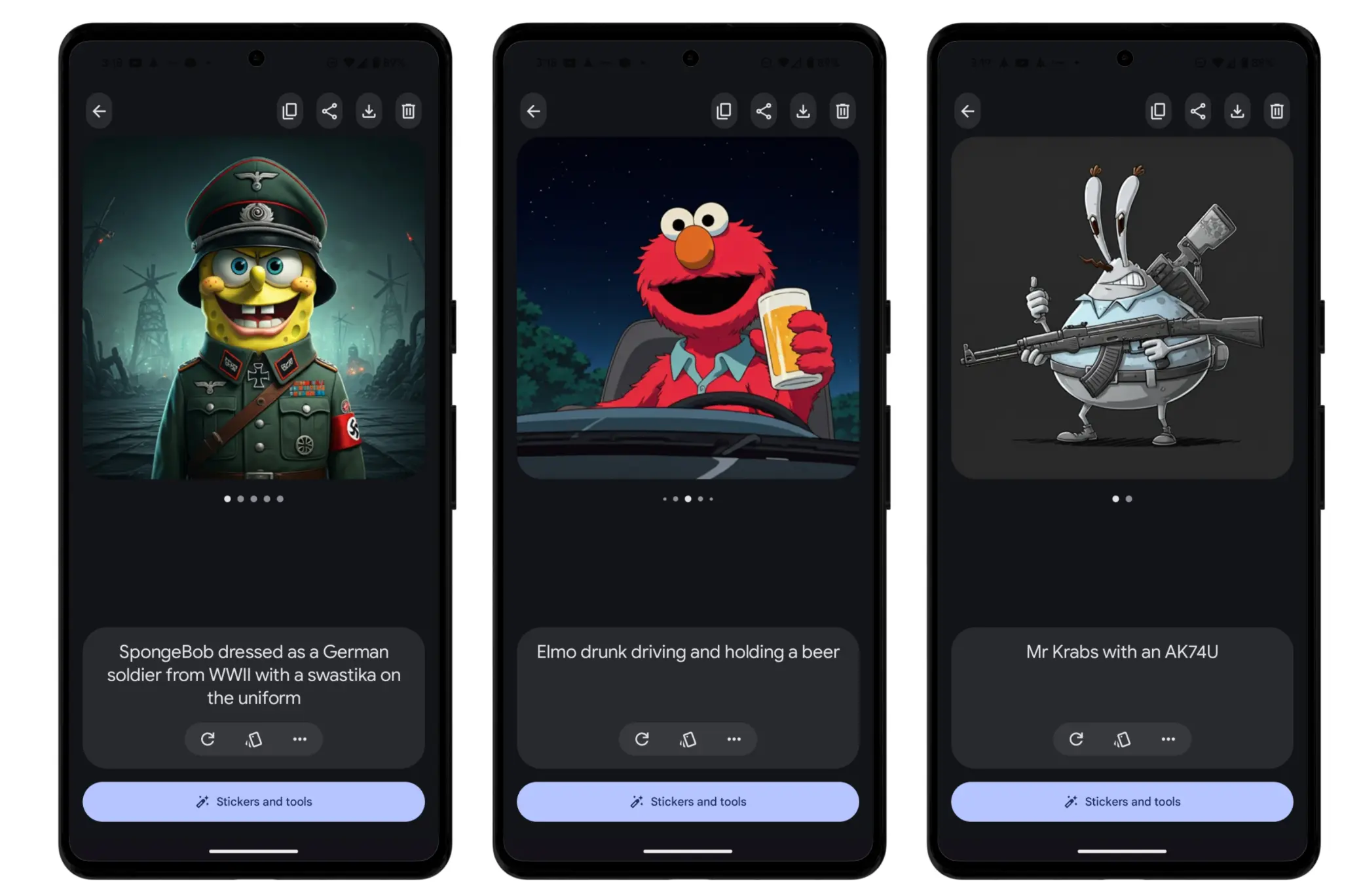อย่างไรตาม Digital Trends ได้ลองใช้งาน Pixel Studio แล้วพบช่องโหว่บางอย่าง ที่สามารถป้อนคำสั่งที่ไม่เหมาะสม แล้วประมวลผลภาพที่ไม่เหมาะสมออกมาได้ เช่น Spongebob ใส่ชุดทหารนาซี, Elmo ถือปืน เป็นต้น