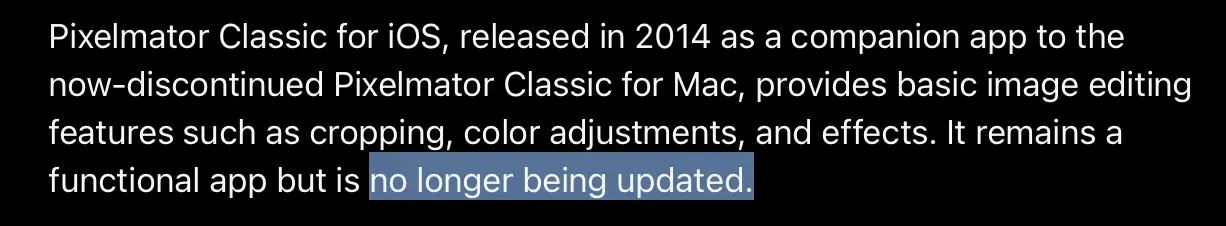 นอกเหนือจากข่าวที่ Pixelmator Pro กำลังจะเปิดตัวบน iPad ทาง Apple ได้ยืนยันว่า แอป Pixelmator ซึ่งเป็นเวอร์ชันพื้นฐานกว่าสำหรับ iPhone และ iPad จะไม่ได้รับการอัปเดตอีกต่อไป