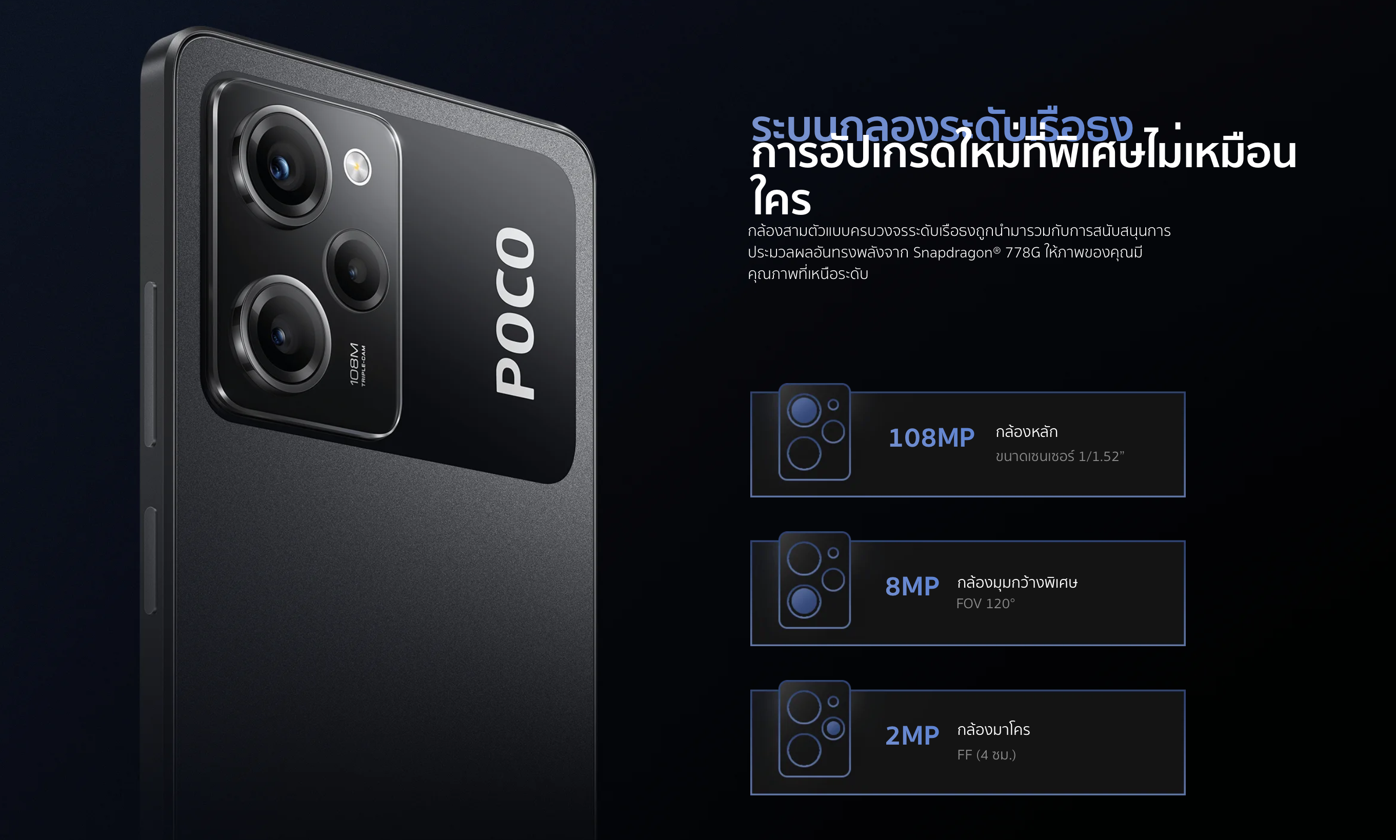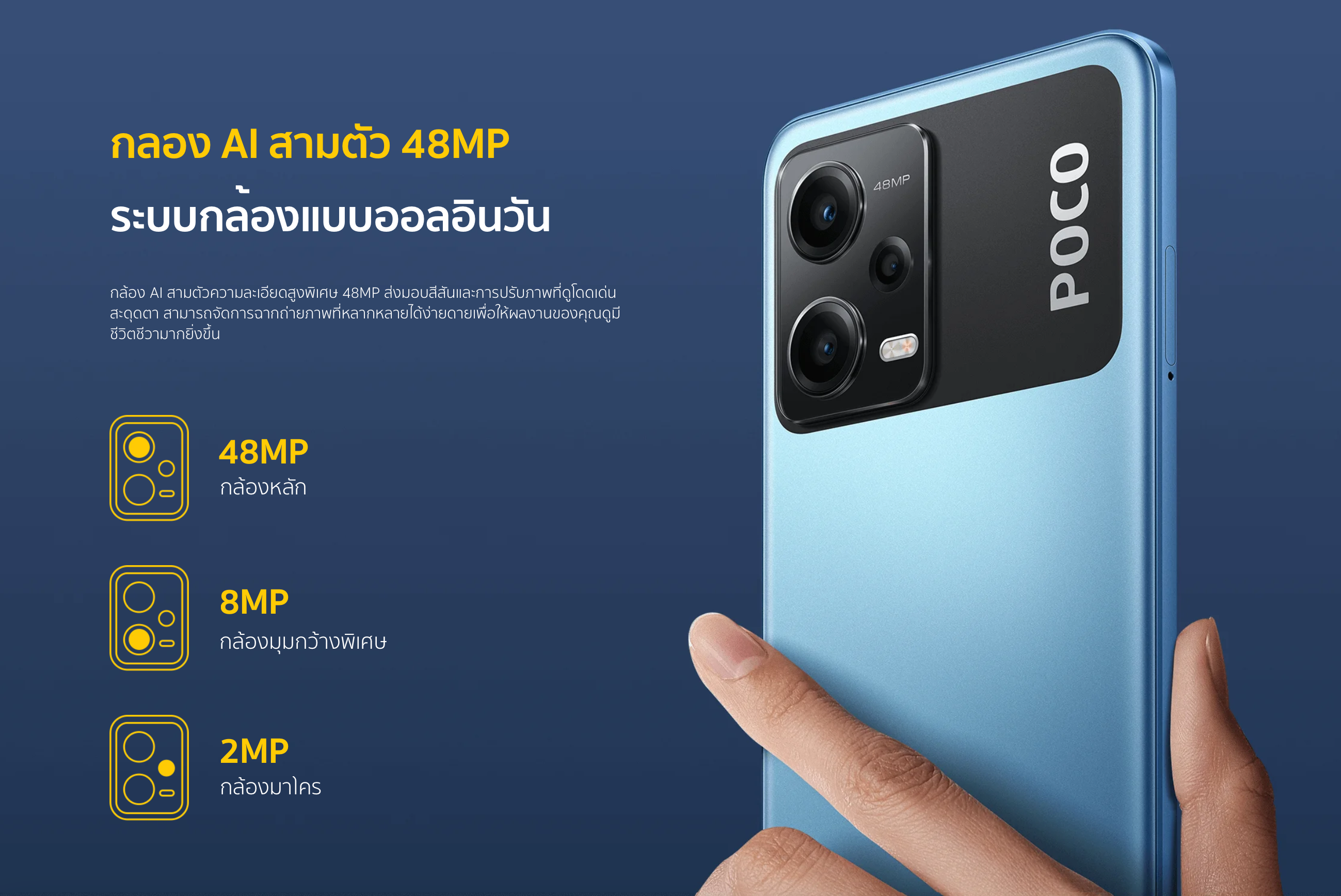 POCO X5 5G มาพร้อมกล้อง AI สามตัว ได้แก่ กล้อง Triple Camera ความละเอียด 48MP (f/1.8), กล้อง Wide 8MP (f/2.2) และกล้อง macro 2 MP (f/2.4)