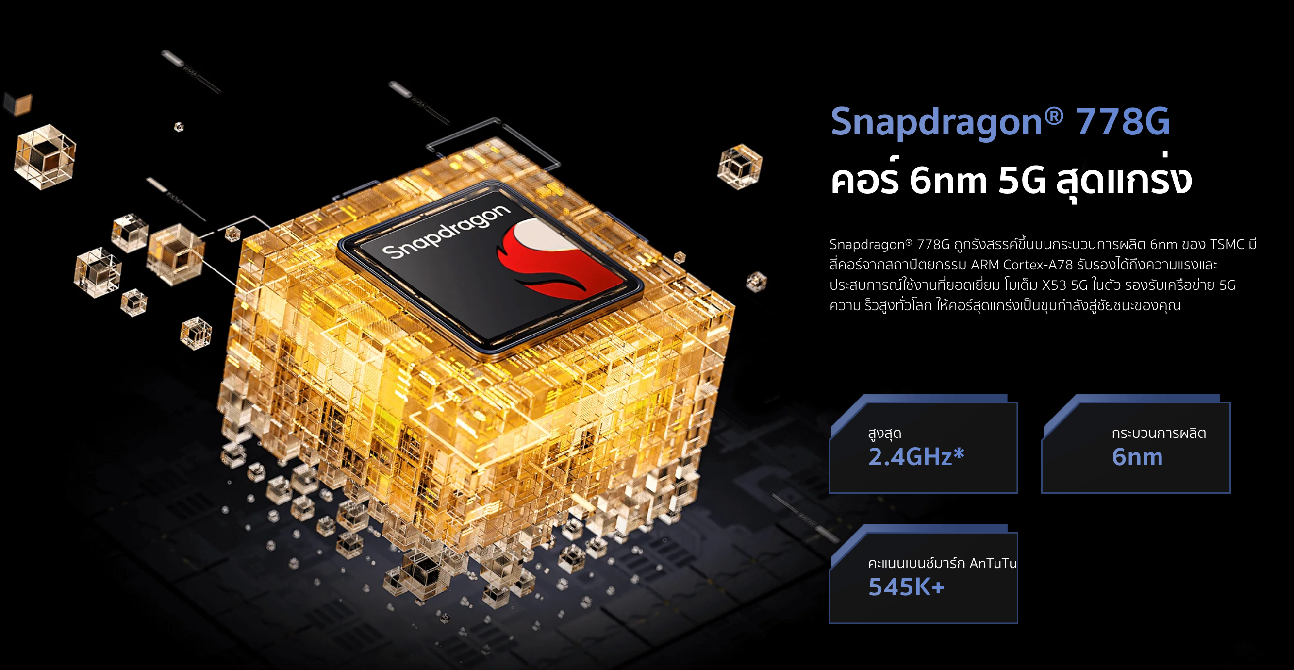 มาพร้อมชิป Qualcomm Snapdragon 778G ความเร็ว 2.4GHz ใช้กระบวนการผลิตแบบ 6nm ของ TSMC มี 4-core จากสถาปัตยกรรม ARM Cortex-A78, ชิปโมเด็ม X53 5G ในตัว