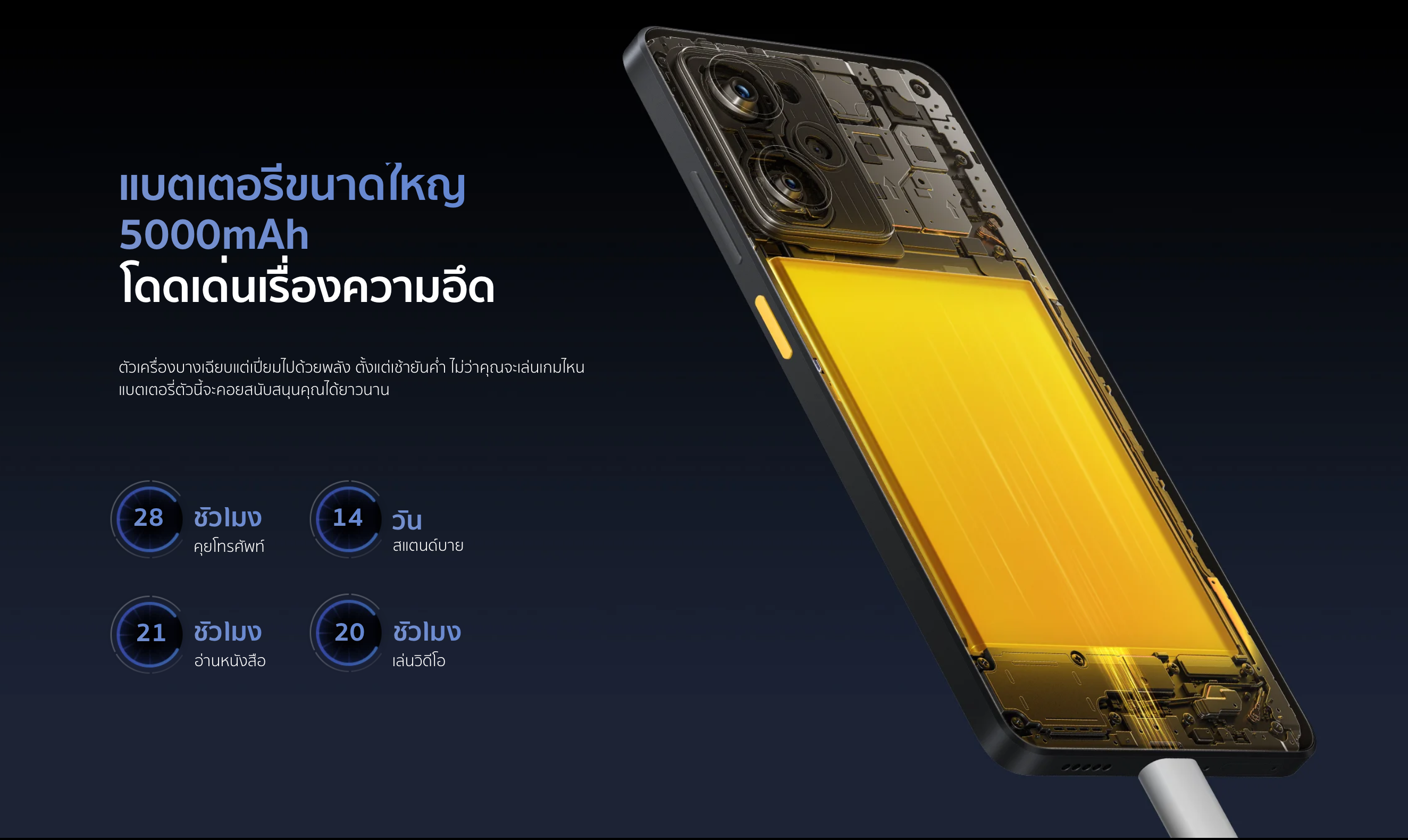 POCO X5 Pro 5G มาพร้อมแบต 5,000 mAh ใช้งานได้ตั้งแต่เช้ายันค่ำ เล่นเกมได้ยาวนานทั้งวัน และมาพร้อมกับเทอร์โบชาร์จ 67W สัมผัสประสบการณ์ชาร์จไฟรวดเร็วทันทีที่เสียบสายชาร์จ
